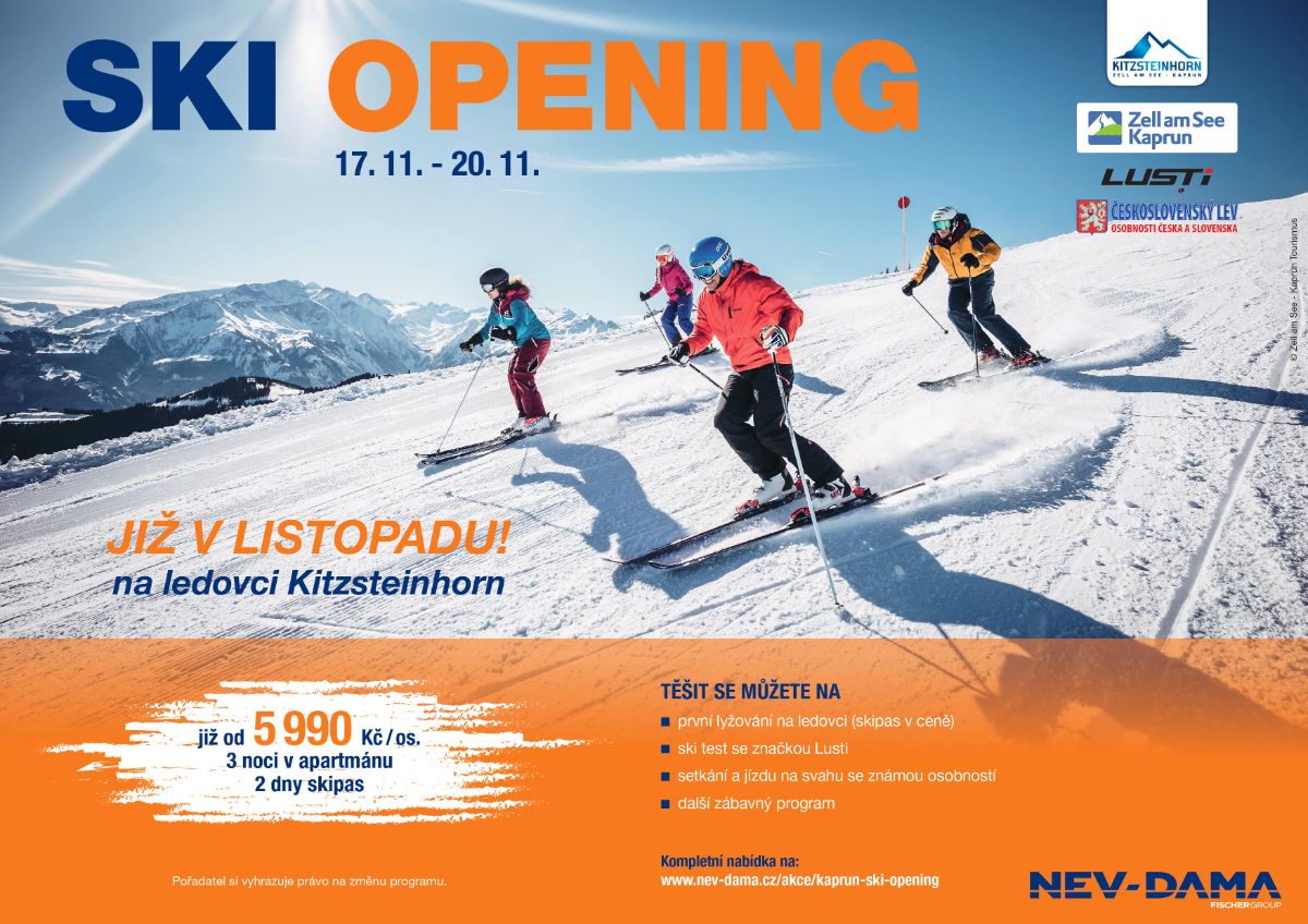 Nemůžete se dočkat, až letos poprvé připnete lyže a pofrčíte dolů ze svahu? Pojeďte s námi přivítat lyžařskou sezónu do rakouských Alp. Letošní Ski Opening jsme naplánovali na prodloužený víkend s využitím listopadového svátku, který vychází na pátek 17.11. Nemusíte si tedy brát ani dovolenou a užijete si perfektní lyžování na ledovci Kitzsteinhorn v oblíbeném středisku Kaprun - Zell am See, jízdu na svahu se známou osobností, testování lyží a další zábavný program.