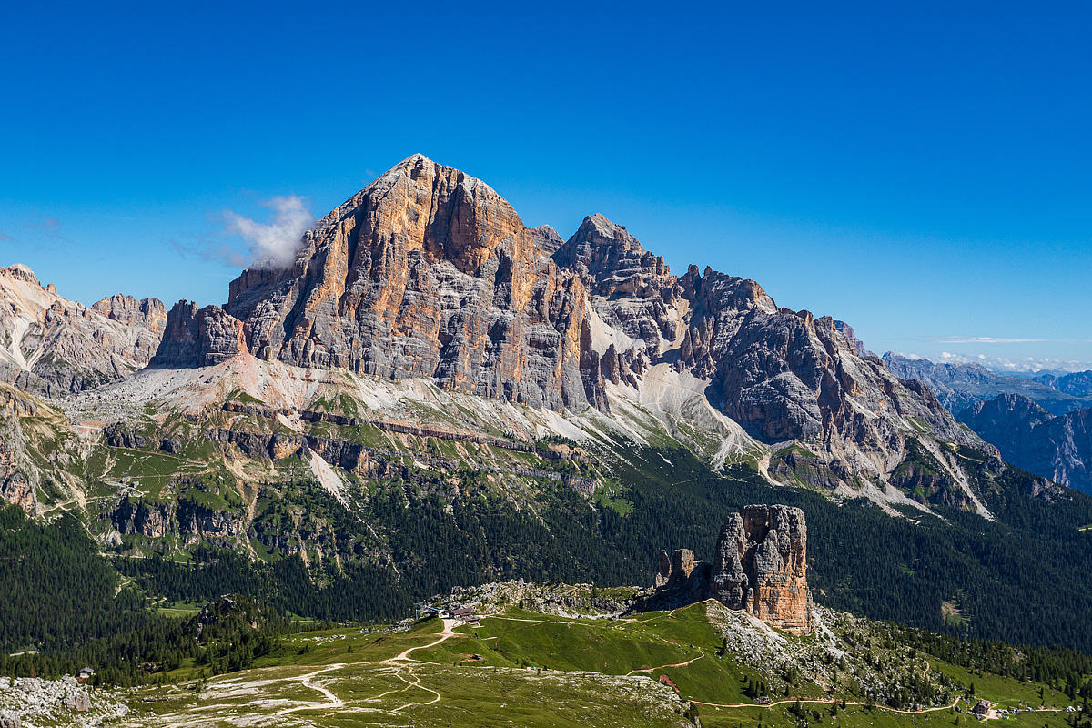 Dnešní den vás zavede na kratší panoramatickou prohlídku přírodního parku Dolomiti d’Ampezzo. Z Cortiny d’Ampezzo vystoupáte k jezeru Ghedina a pak k horské chatě Rifugio Cinque Torri. Po pravé straně můžete obdivovat skalní útvar Cinque Torri (2.361 m), skládající se z pěti strmých věží, které kdysi tvořily jeden velký balvan. Před vámi stojí také jeden ze tří nejvyšších vrcholů Dolomit, Monte Pelmo (3.168 m). Jedná se o jeden z prvních velkých vrcholů v Dolomitech, na který člověk vystoupil. Jednodušší varianta vás zavede ke kabinové lanovce Col Druscie z Cortiny (jízdné není v ceně) a následně budete pokračovat na kole na Cinque Torri (je možné využít také sedačkovou lanovku, jízdné není v ceně).