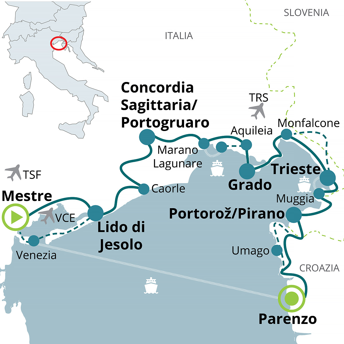 Atraktivní itinerář podél pobřeží Jaderského moře – z Benátek pojedete na kole podél pláží Jadranu přes známá přímořská letoviska jako Jesolo a Caorle, projedete Terstem, hlavním městem autonomního regionu Friuli-Venezia Giulia, s rakousko-uherským šarmem, a nakonec chorvatským poloostrovem Istrie do proslulé Poreče, památky UNESCO.