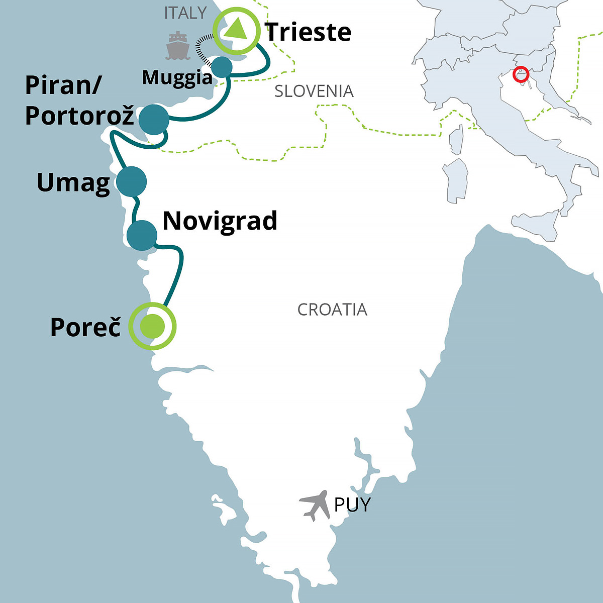 Terst, místo setkání mezi národy Středomoří a národy střední Evropy, první přístav habsburské říše v 16. století, je výchozím bodem této cesty. Dnes je Terst živým pohraničním městem plným památek, kostelů, muzeí a paláců. Trasa opouští Itálii a pojedete na kole nejprve přes Slovinsko a poté podél barevného chorvatského pobřeží. Tento slunný poloostrov na Jadranu je malebnou sbírkou rybářských vesniček, městeček, krasových kopců, údolí a vinic. Okouzlí vás kontrast míst a barev a nebude nouze ani o možnosti relaxace u moře v jedné z četných zátok a zálivů.