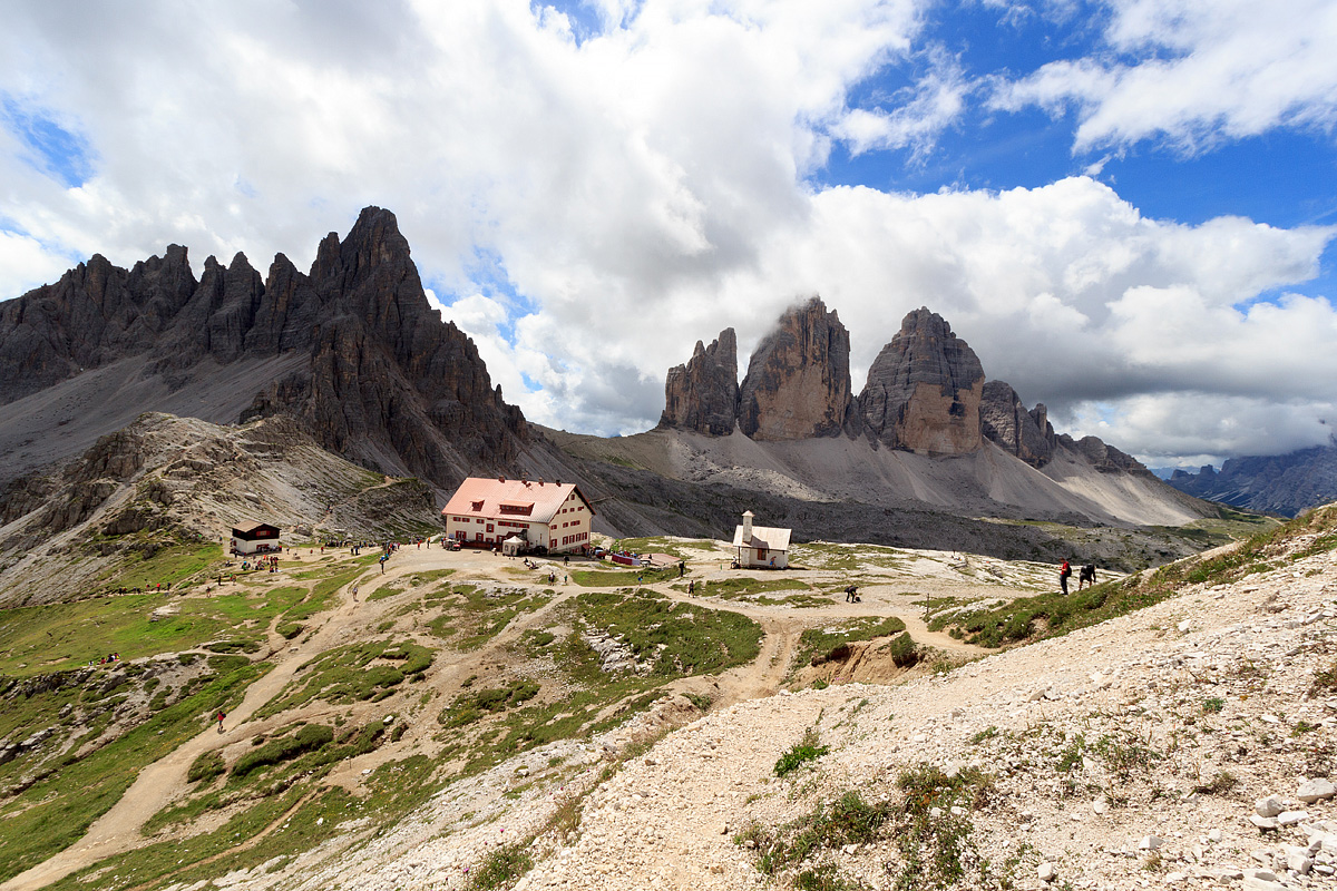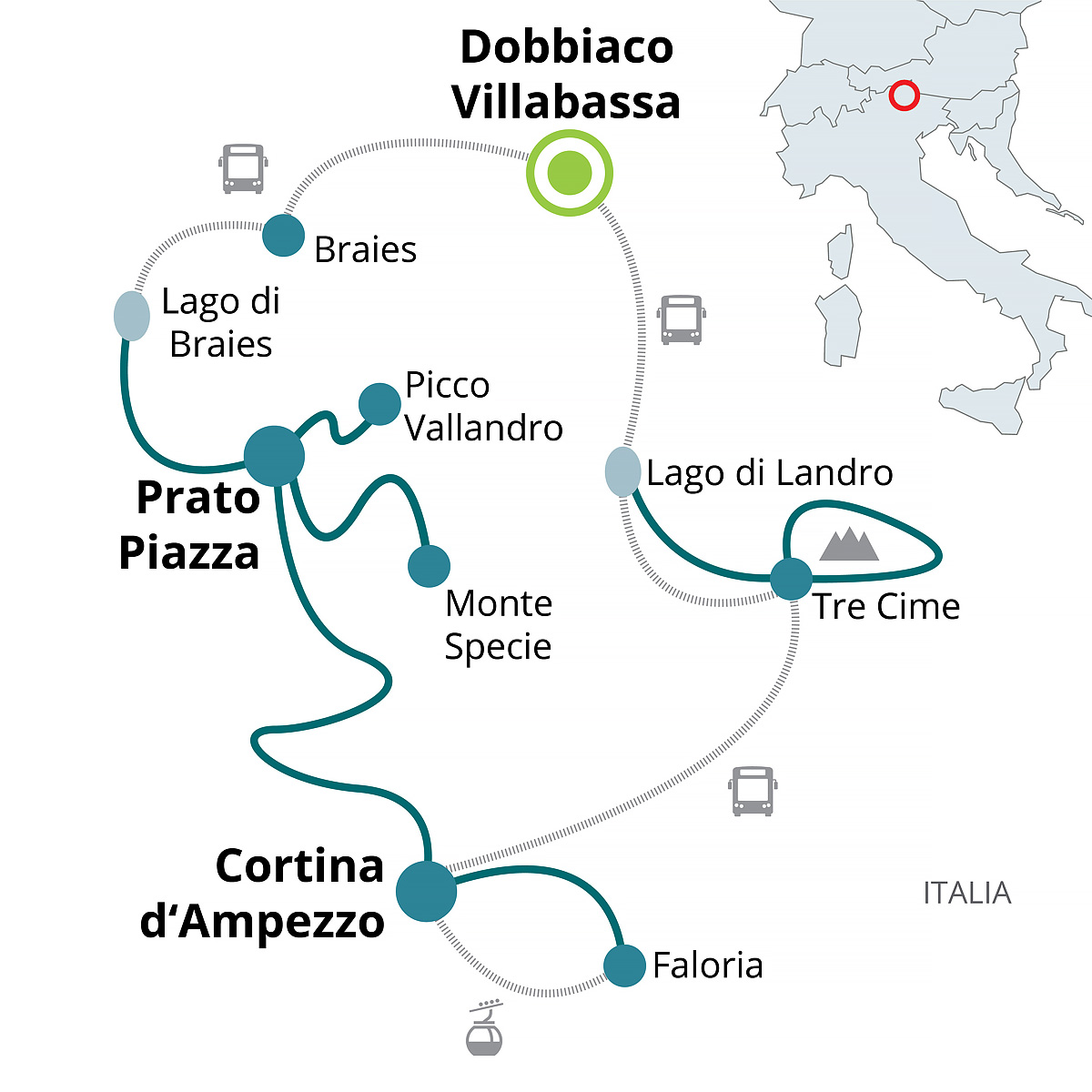 Ráno pojedete autobusem (jízdné v ceně) až k horské chatě Rifugio Auronzo, výchozího bodu poslední etapy. Rifugio se nachází přímo na úpatí slavného skalního masivu Tre Cime di Lavaredo, pravděpodobně nejznámějšího skalního útvaru v Dolomitech a dějiště frontové linie mezi Itálií a Rakouskem Uherskem během první světové války. Odtud se vydáte pěšky údolím Valle del Rienza až k panoramatickému bodu na vrcholy Tre Cime a poté se vrátíte autobusem do Villabassy nebo Dobbiaca (jízdné není v ceně). Krátká varianta: transfer na Rifugio Auronzo z Cortiny, okružní trasa kolem vrcholů Tre Cime s návratem k horské chatě Rifugio Auronzo; odtud návrat autobusem do Villabassy nebo Dobbiaca (jízdné není v ceně).