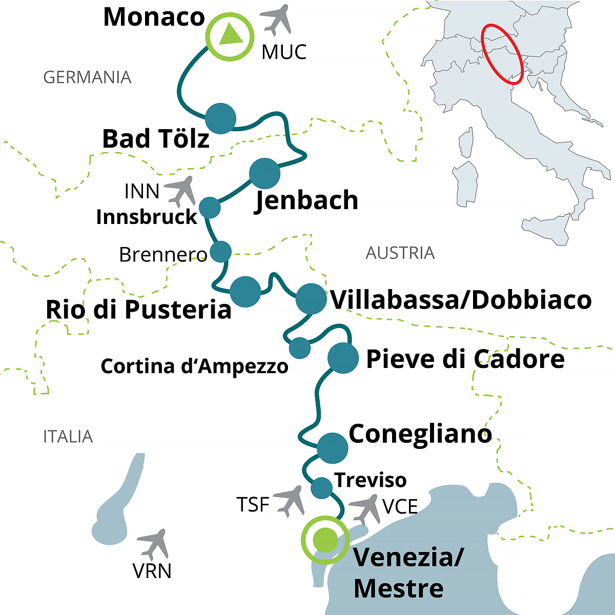 Na cyklostezkách, cyklistických trasách a vedlejších silnicích objevíte mnoho mimořádných přírodních a kulturních krás těchto tří zemí. Cyklotrasa začíná v bavorské metropoli Mnichov a končí v lagunovém městě Benátky. Vede nejdříve podél bavorských jezer a řeky Inn v tyrolském údolí Inntal, poté pokračuje přes nádherné Dolomity, součást přírodního dědictví UNESCO, nejdříve do Trevisa a poté do lagunového města Benátky s kanály a historickými budovami. Jedinečné střídání velkých měst a malých romantických vesniček, jezer, údolí, hradů a pevností... tuto trasu si nelze nezamilovat!