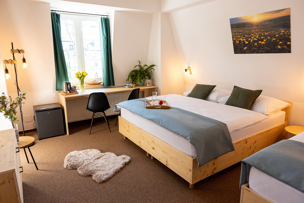 pokoj s manželskou postelí či s oddělitelnými lůžky, s možností 1 přistýlky, sociální zařízení