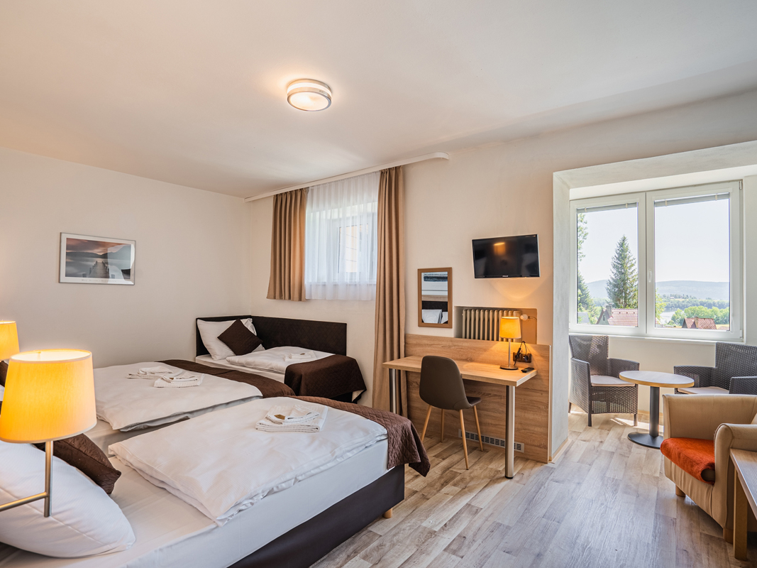 18 m² - pokoj s manželskou postelí či 2 samostatnými lůžky a 1 samostatným lůžkem, sociální zařízení