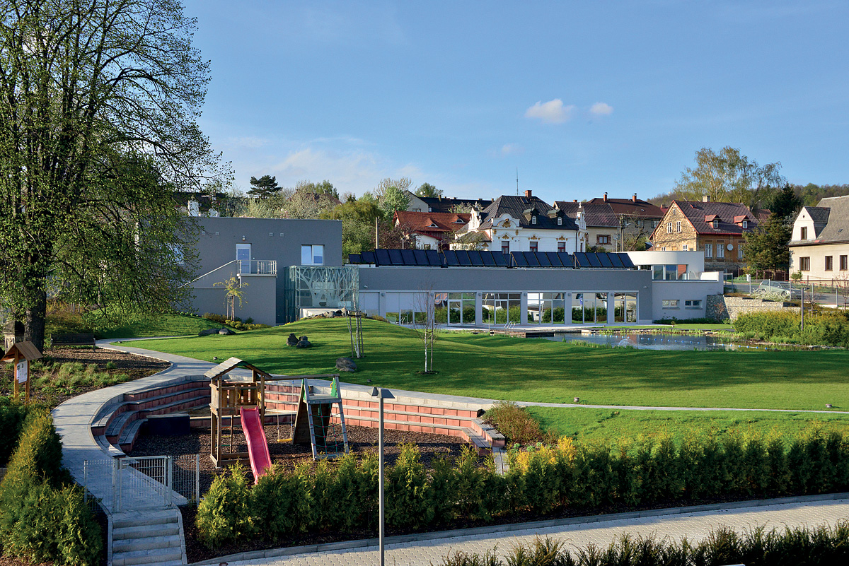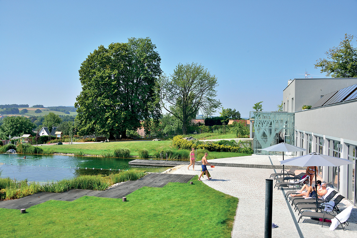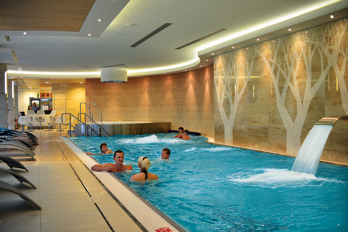 vnitřní bazén s protiproudem a vodoléčbou; venkovní bazén (biotop) s 20 m plaveckou dráhou, molem, lehátky a slunečníky; vnitřní vířivka až pro 10 osob, finská sauna, pára, infrasauna*, relaxační místnost s lehátky a výhledem; masáže*, perličková koupel*, suchá masážní vana*, turbosolárium*; nadstandardně vybavená posilovna, tělocvična, 2x kurt na squash či badminton; venkovní prostor vyhrazený pro cvičení, tenisový kurt, dráha na petanque