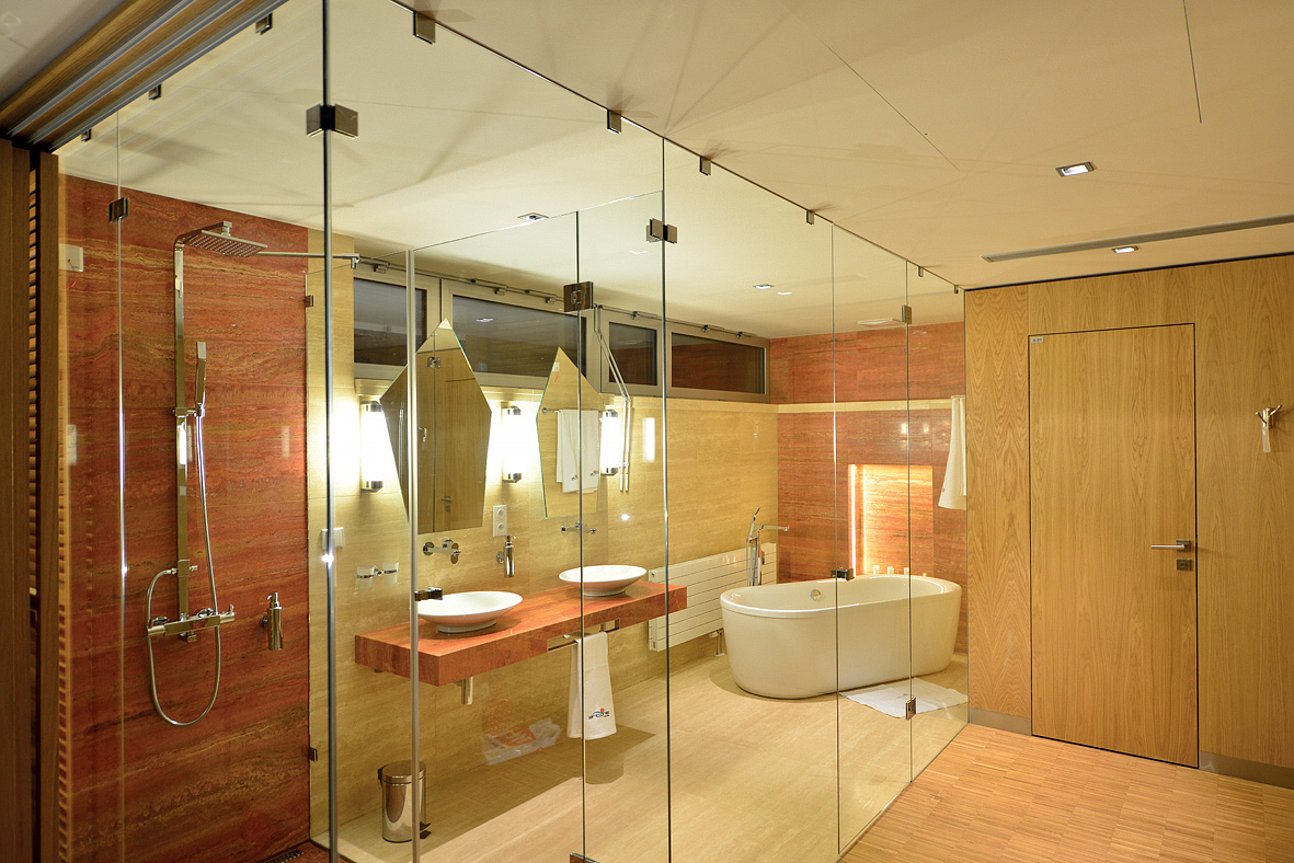 45 m² - prostorný pokoj s manželskou postelí "super king size" s oddělitelnými lůžky, sociální zařízení se sprchou a vanou, velká terasa, možnost 1 přistýlky
