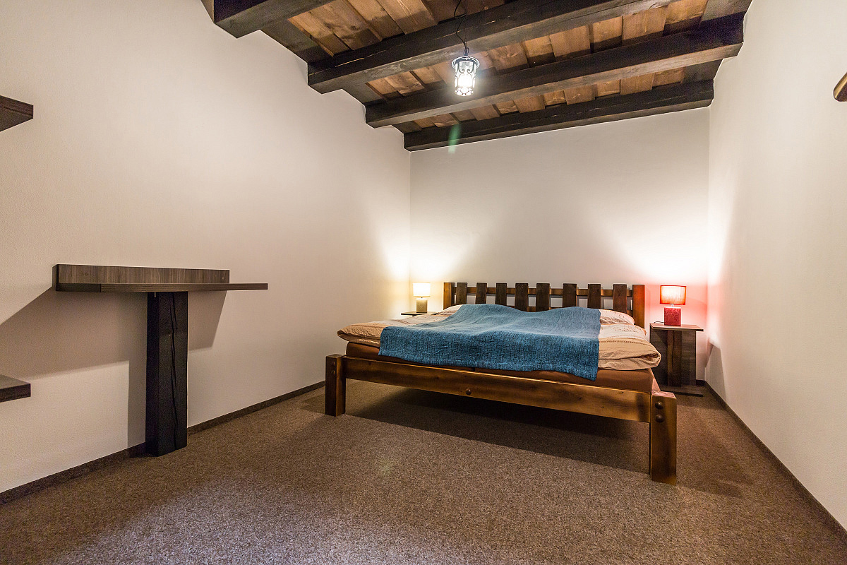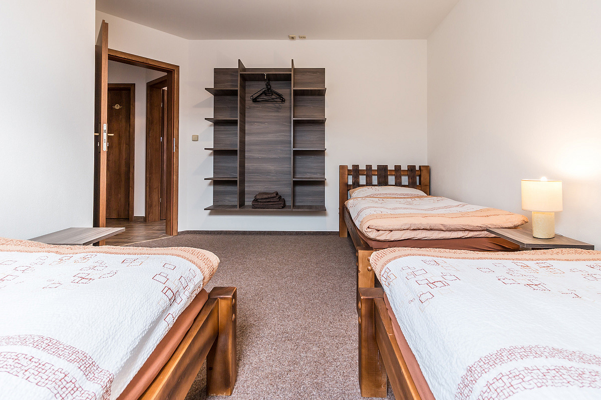 apartmán se 2 oddělenými ložnicemi, jedna ložnice s manželskou postelí či 2 samostatnými lůžky, druhá ložnice se 3 samostatnými lůžky, obývací místnost s kuchyňským koutem, sociální zařízení