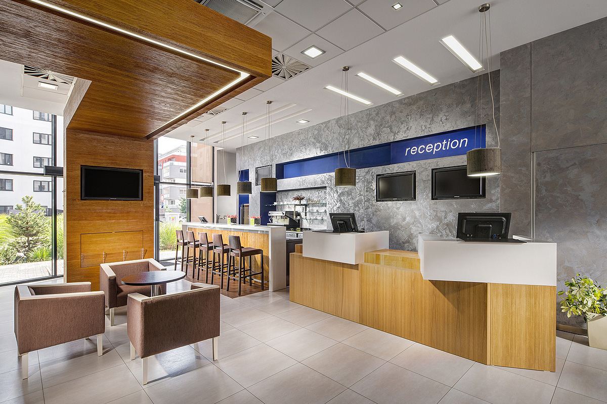 recepce, lobby bar, restaurace na snídaně, prodejní automat na občerstvení, konferenční salonky s projekční technikou až pro 240 osob, venkovní terasa, úschovna kol, výtah, vyhrazené parkoviště a garáže* / nabíjecí stanice na elektroauta*, wi-fi připojení k internetu