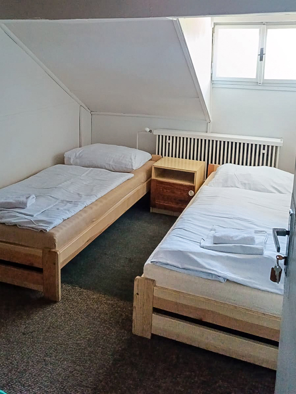 pokoj s manželskou postelí či oddělitelnými lůžky, společné (uzamykatelné) sociální zařízení vždy na patře