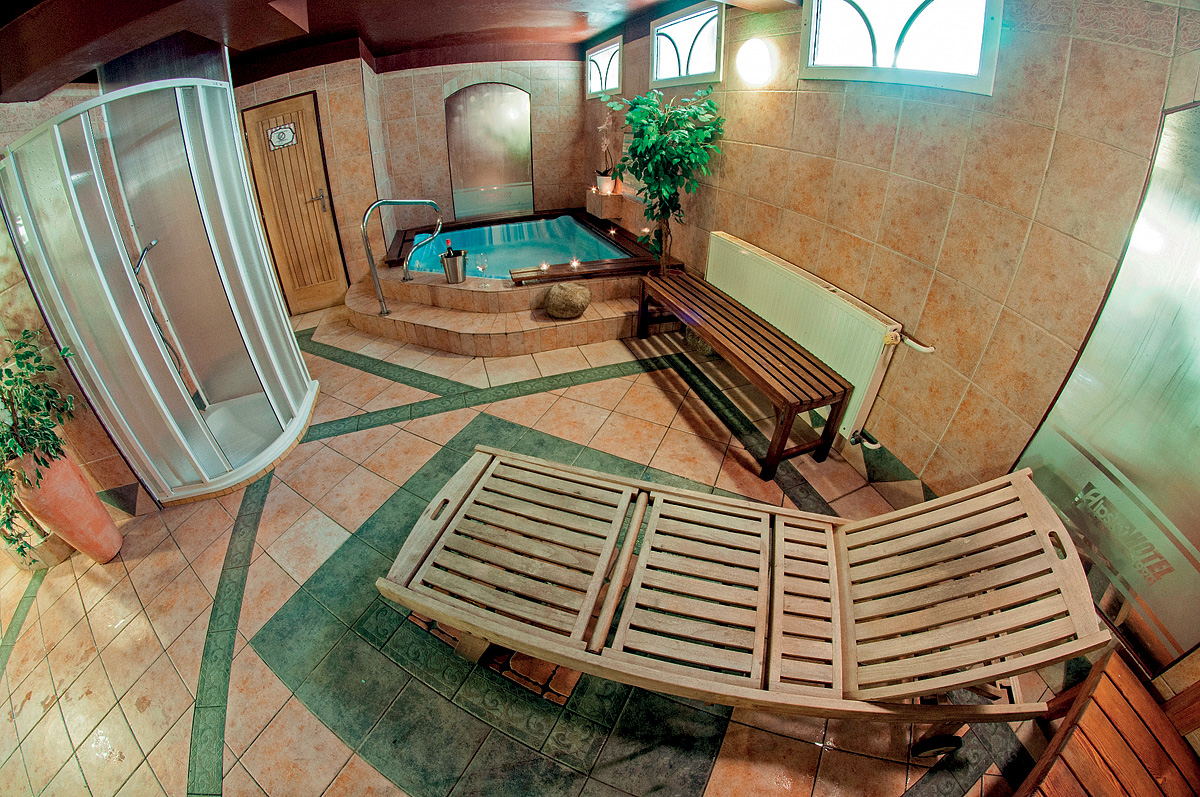 vířivka, finská sauna, ochlazovací bazének, masáže*, biliár*, šipky*, stolní fotbal*