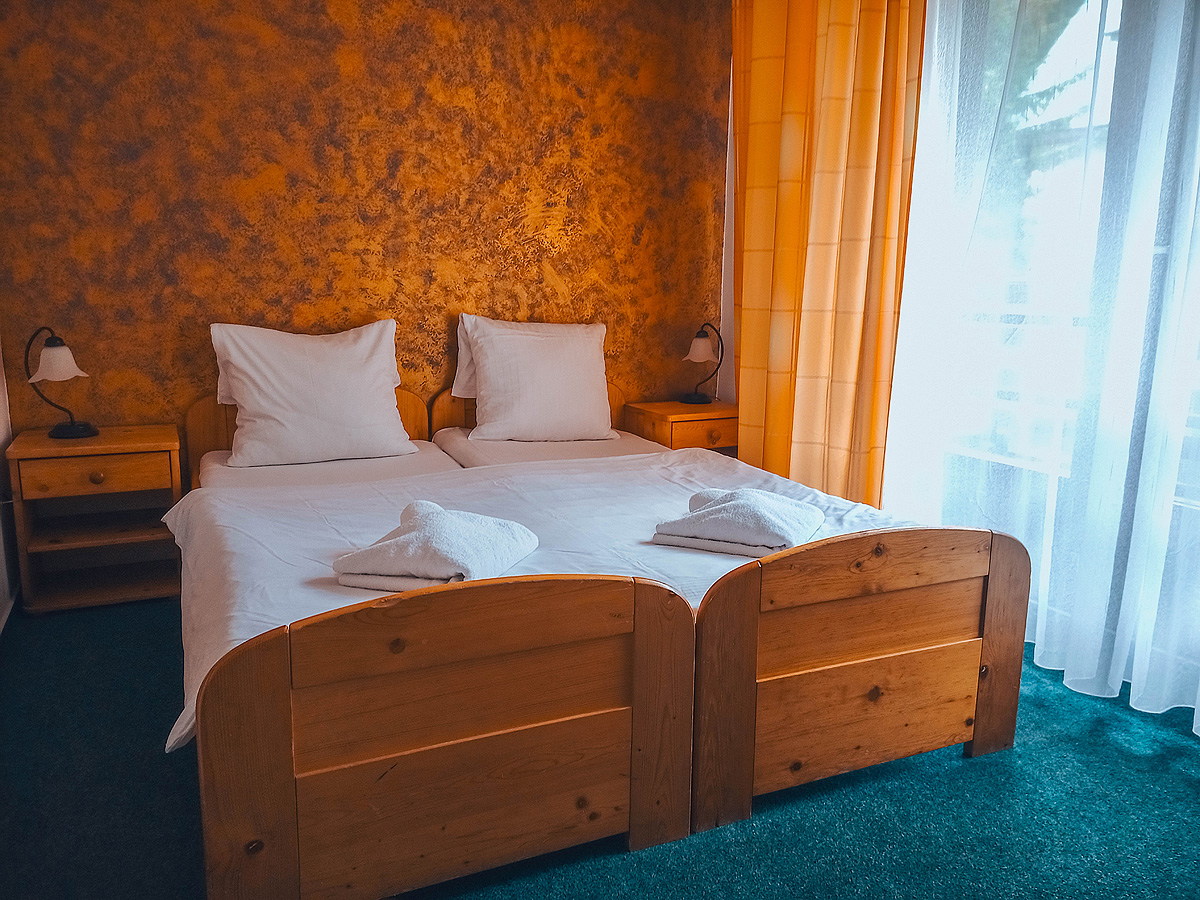 pokoj s manželskou postelí se zpravidla oddělitelnými lůžky a 1 přistýlkou pro dítě do 12 let, sociální zařízení