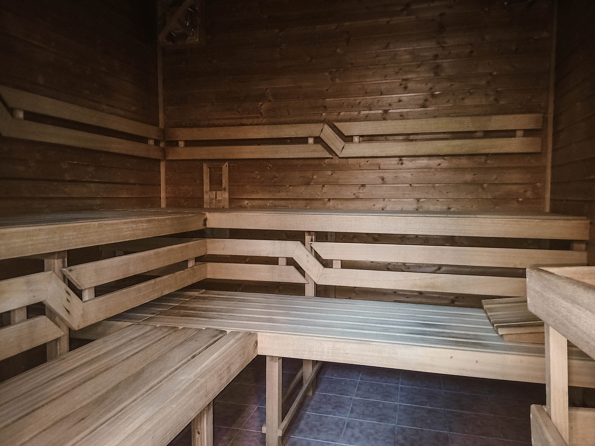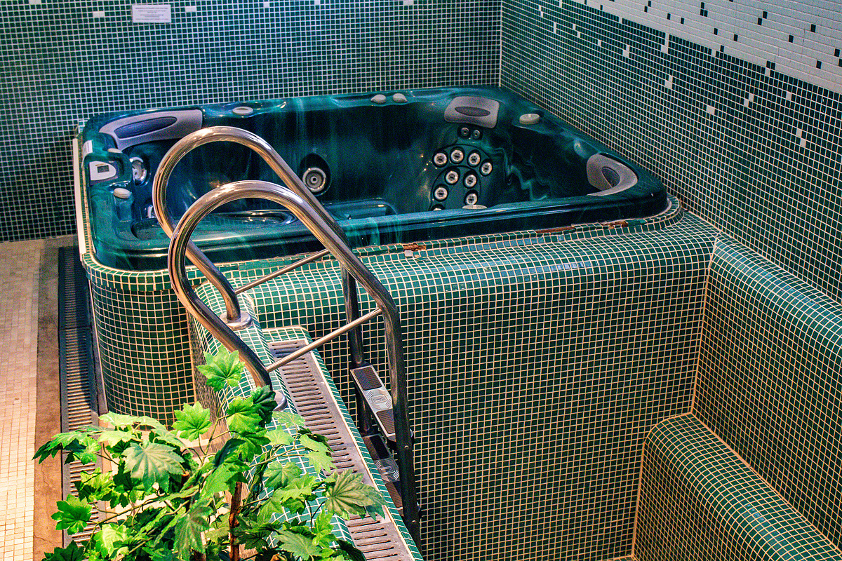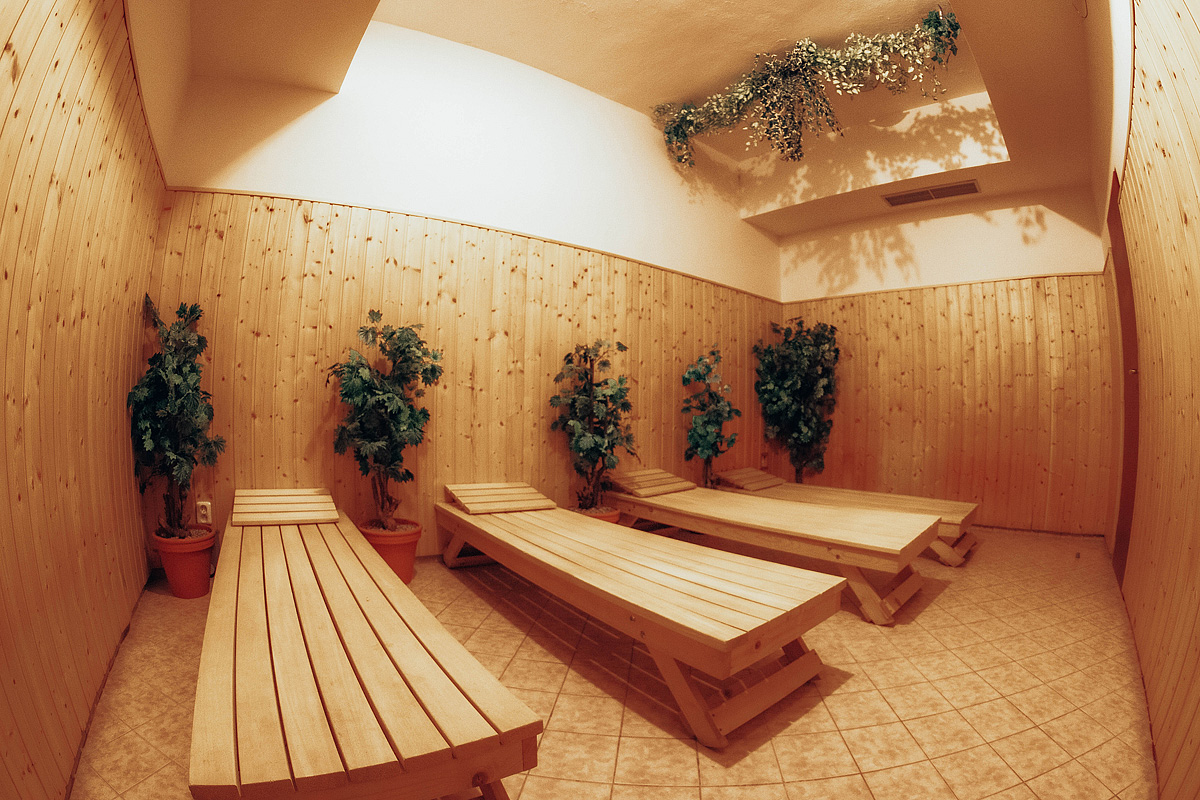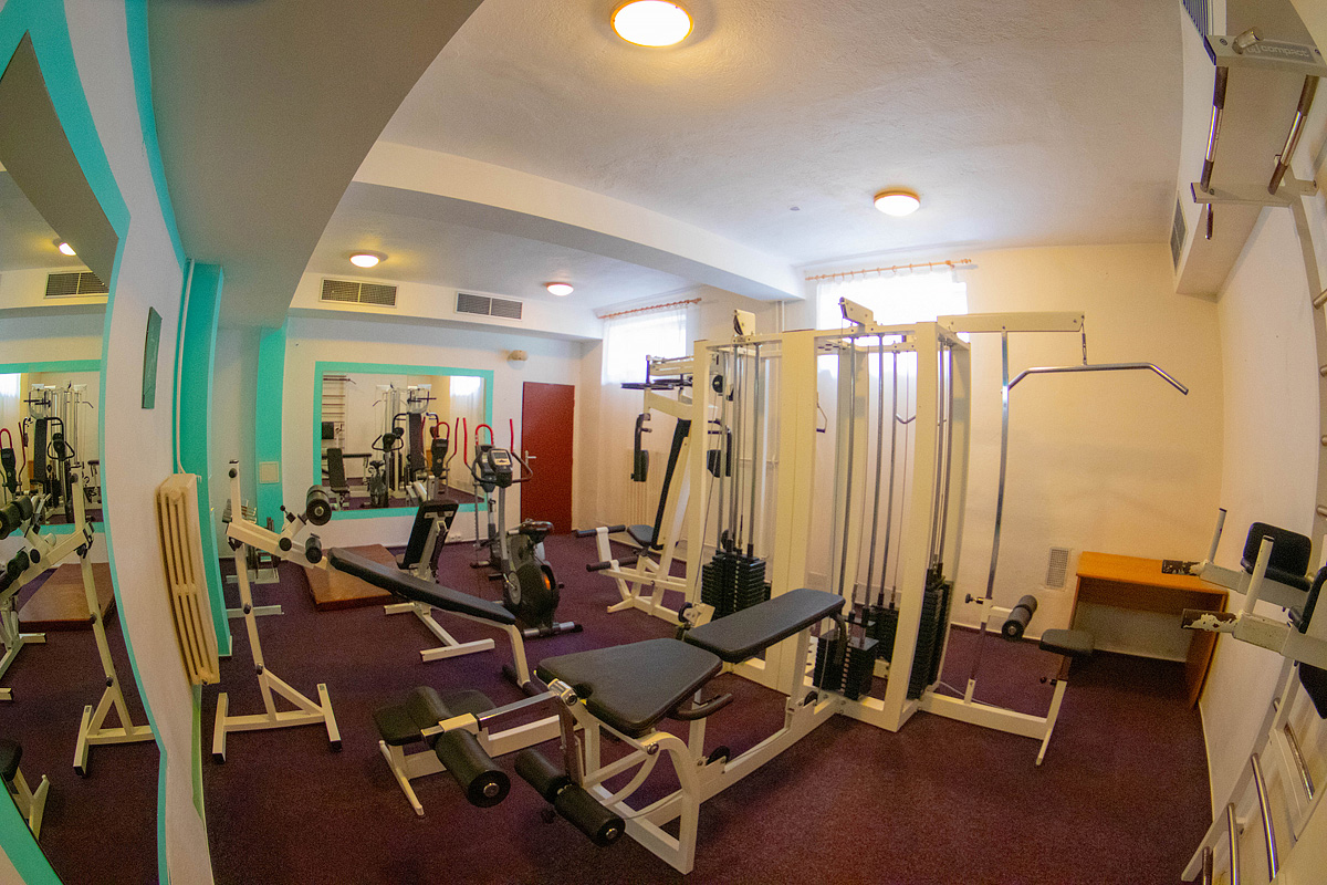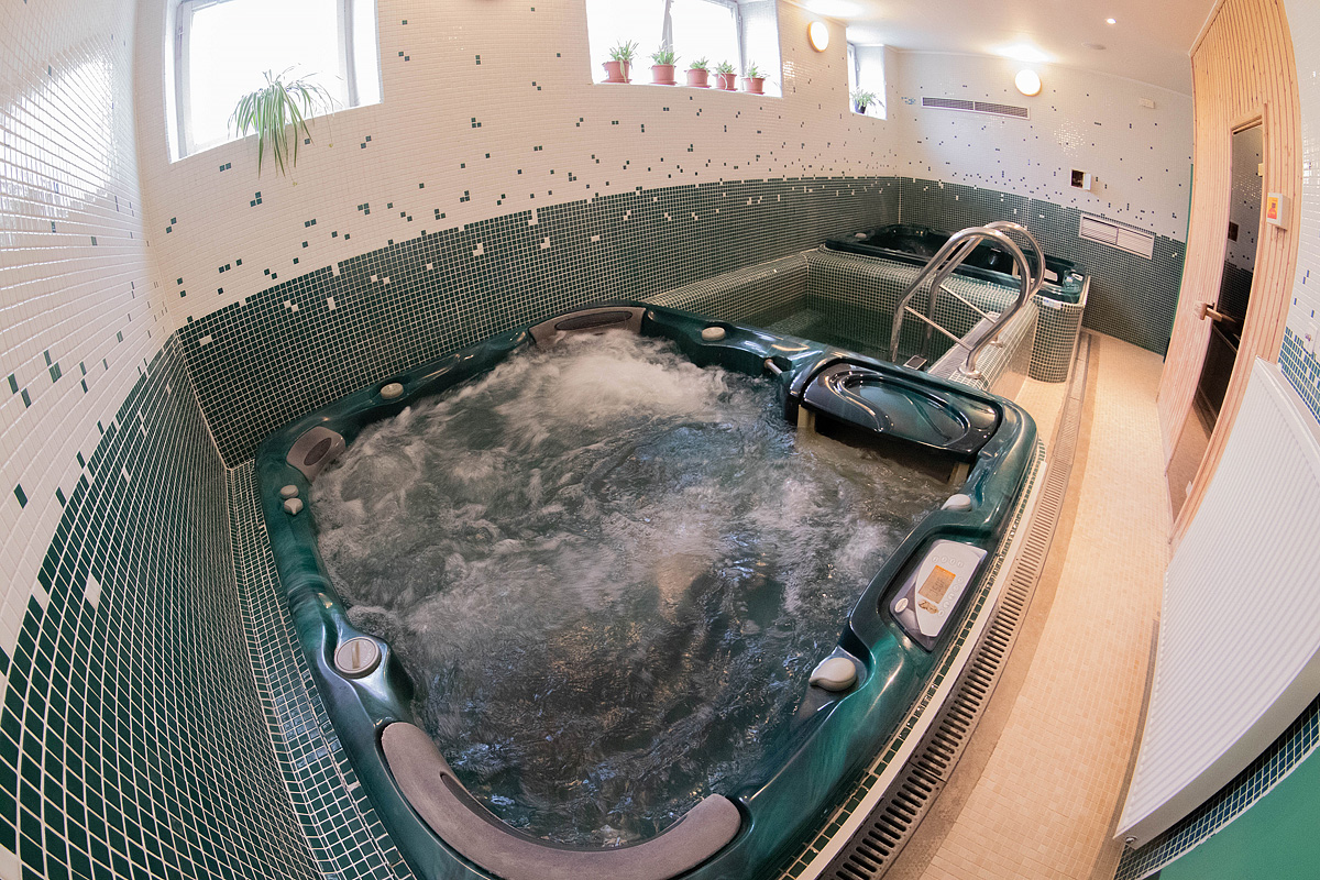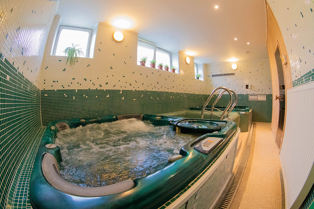 venkovní bazén, 2x vířivka* až pro 8 osob, finská sauna*, ledová lázeň, posilovna, biliár*, stolní tenis, stolní fotbal*; nachází se v budově Stráž