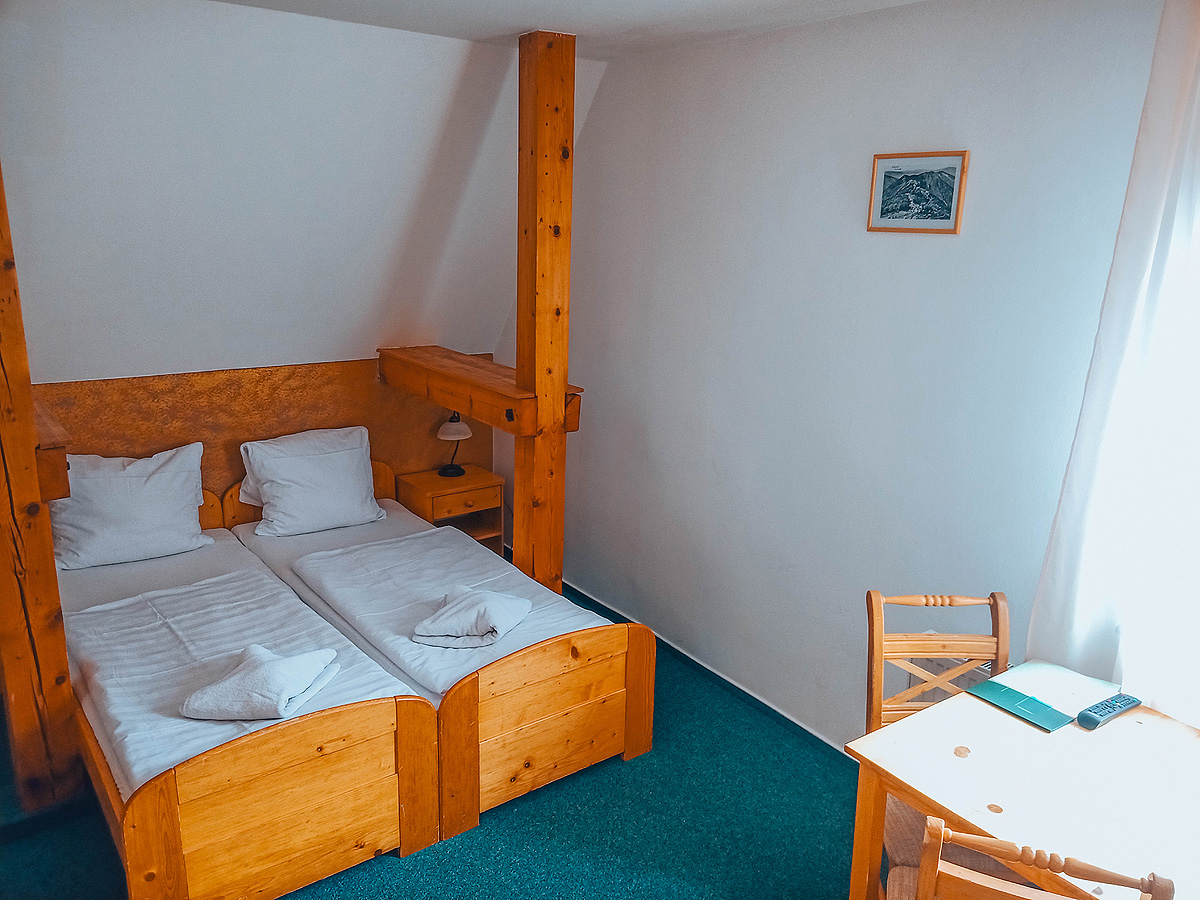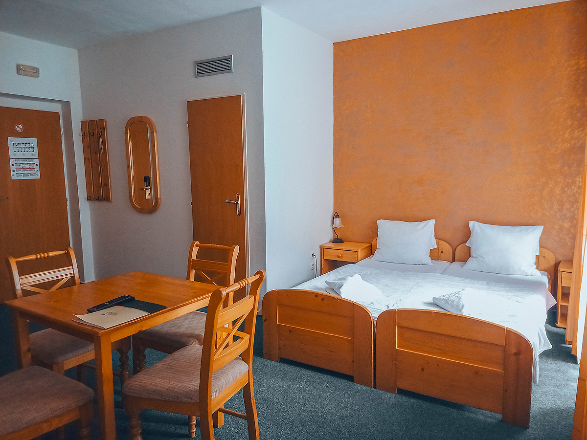 pokoj s manželskou postelí či 2 samostatnými lůžky a přistýlkou formou rozkládacího křesla na lůžko, sociální zařízení zpravidla se sprchou, zřídka balkon
