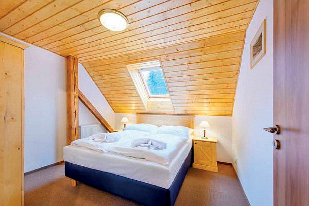 menší pokoj s manželskou postelí či 2 samostatnými lůžky, sociální zařízení