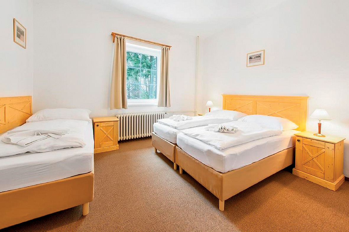 větší pokoj zpravidla s manželskou postelí a 2 samostatnými lůžky, sociální zařízení