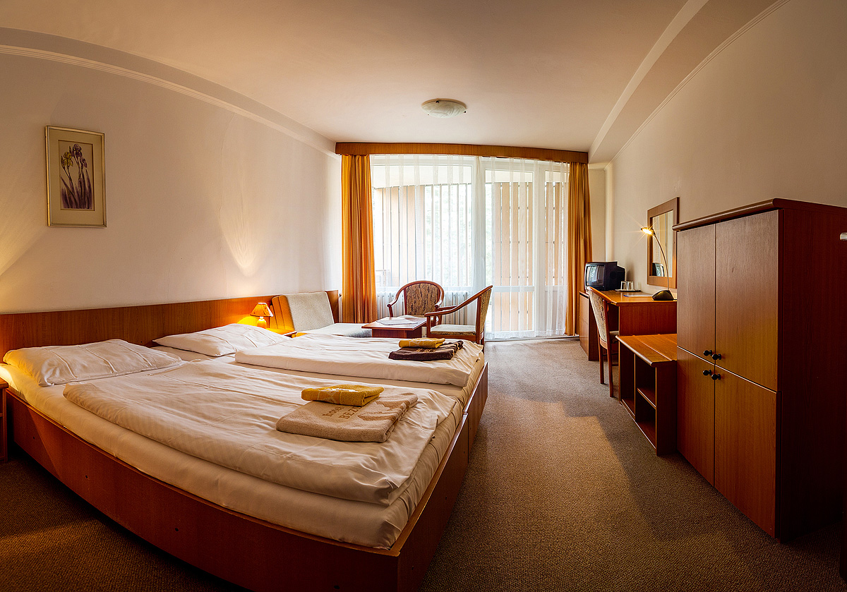 pokoj s manželskou postelí či 2 samostatnými lůžky, sociální zařízení se sprchou či vanou, balkon