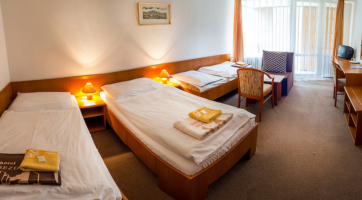 pokoj s manželskou postelí a 1 samostatným lůžkem a 1 přistýlkou pro dítě do nedovršených 12 let, sociální zařízení se sprchou či vanou