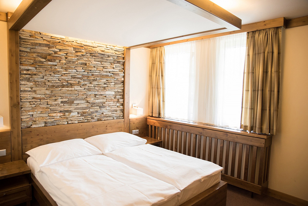 prostorný pokoj s manželskou postelí či s oddělitelnými lůžky s možností přistýlek pro 1 až 2 děti do nedovršených 12 let, zpravidla rozkládací gauč, sociální zařízení