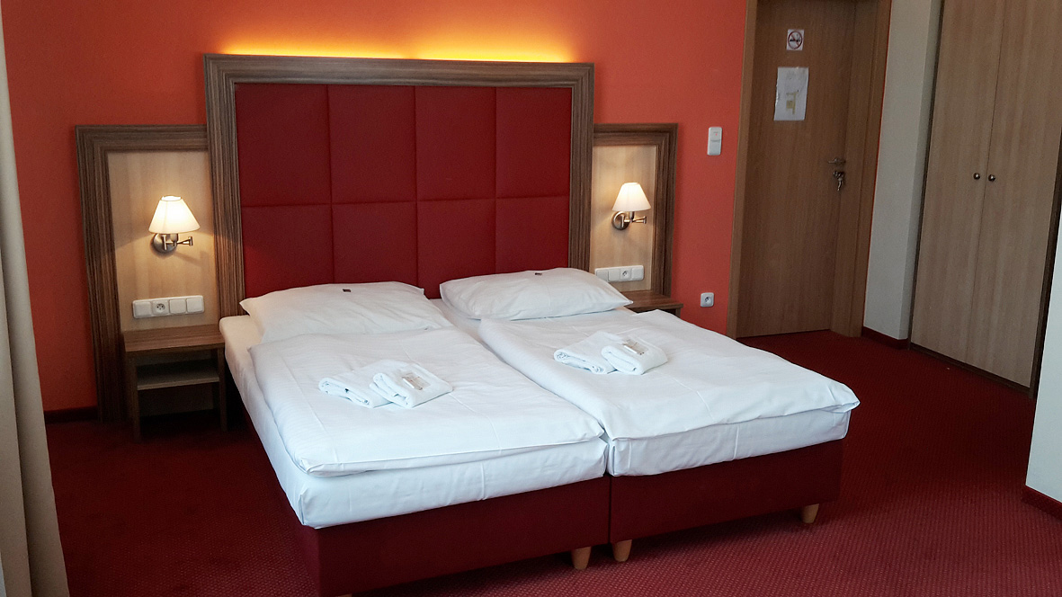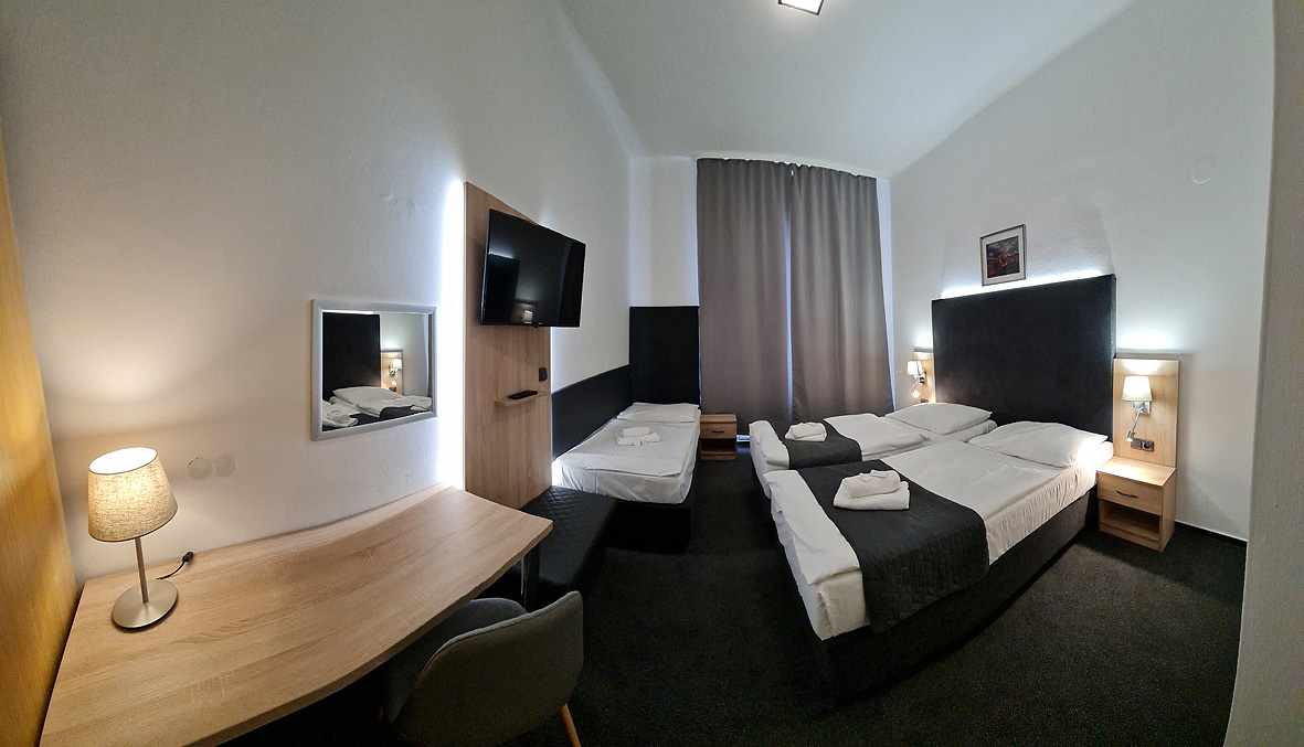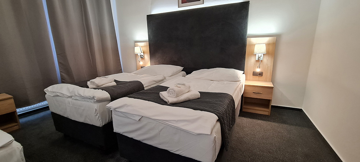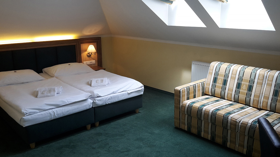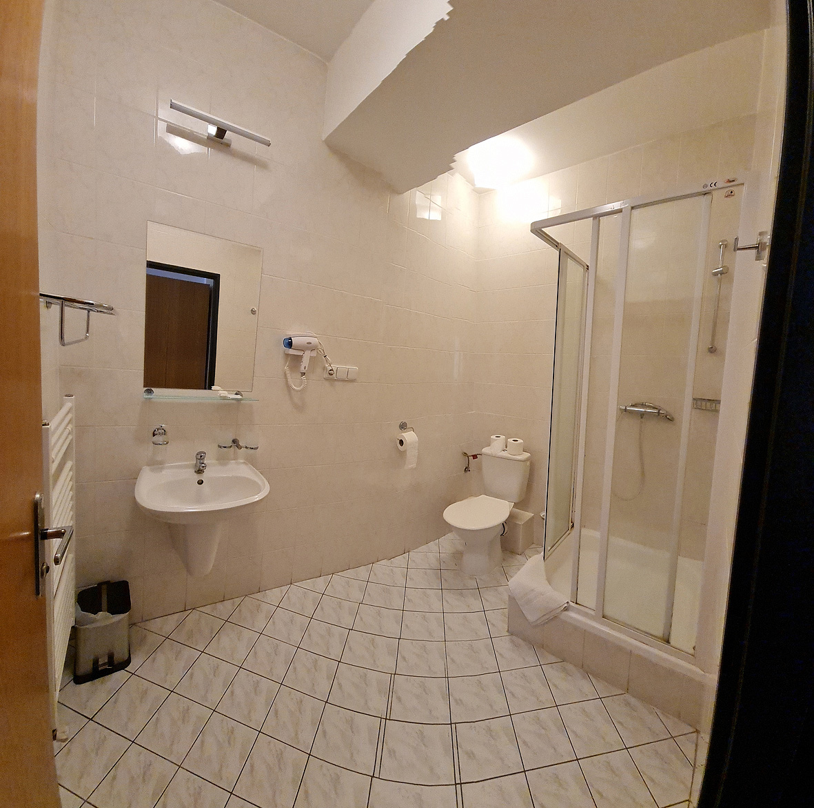 pokoj s manželskou postelí s oddělitelnými lůžky, možnost 2 přistýlek, sociální zařízení se sprchou či vanou