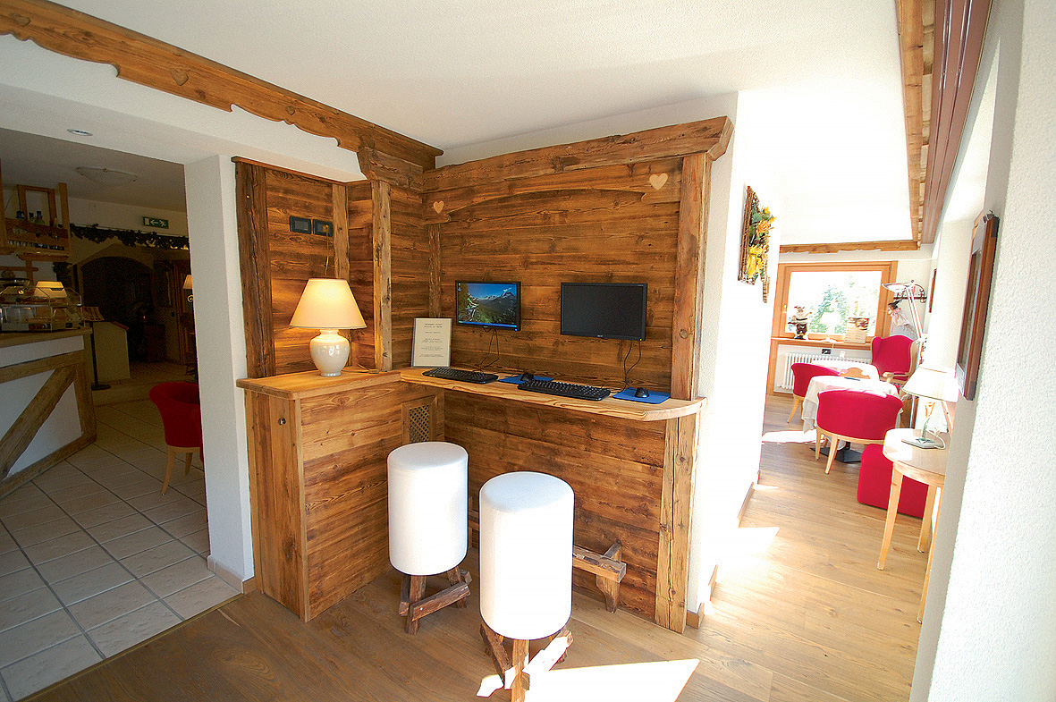 recepce / menší lobby, restaurace, bar s krbem, společenská místnost s kamny a TV, sluneční terasa s posezením, výtah, vyhrazené parkoviště, internet point / wi-fi připojení k internetu