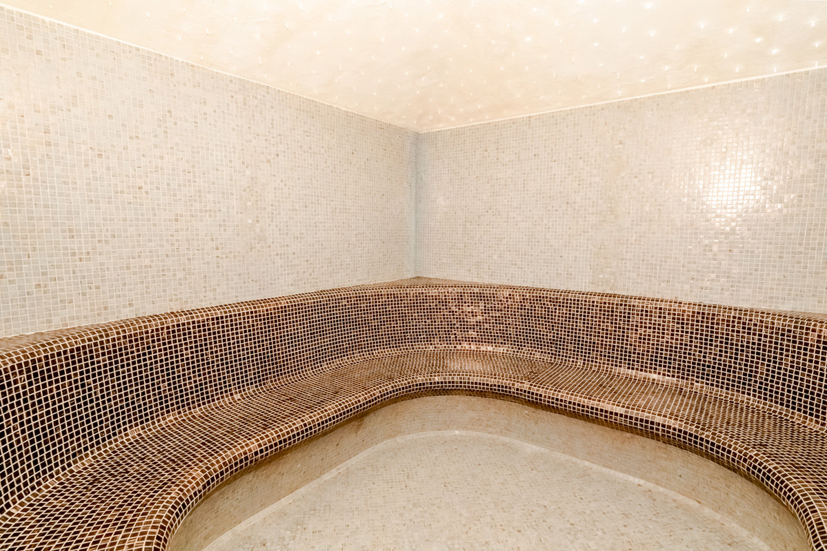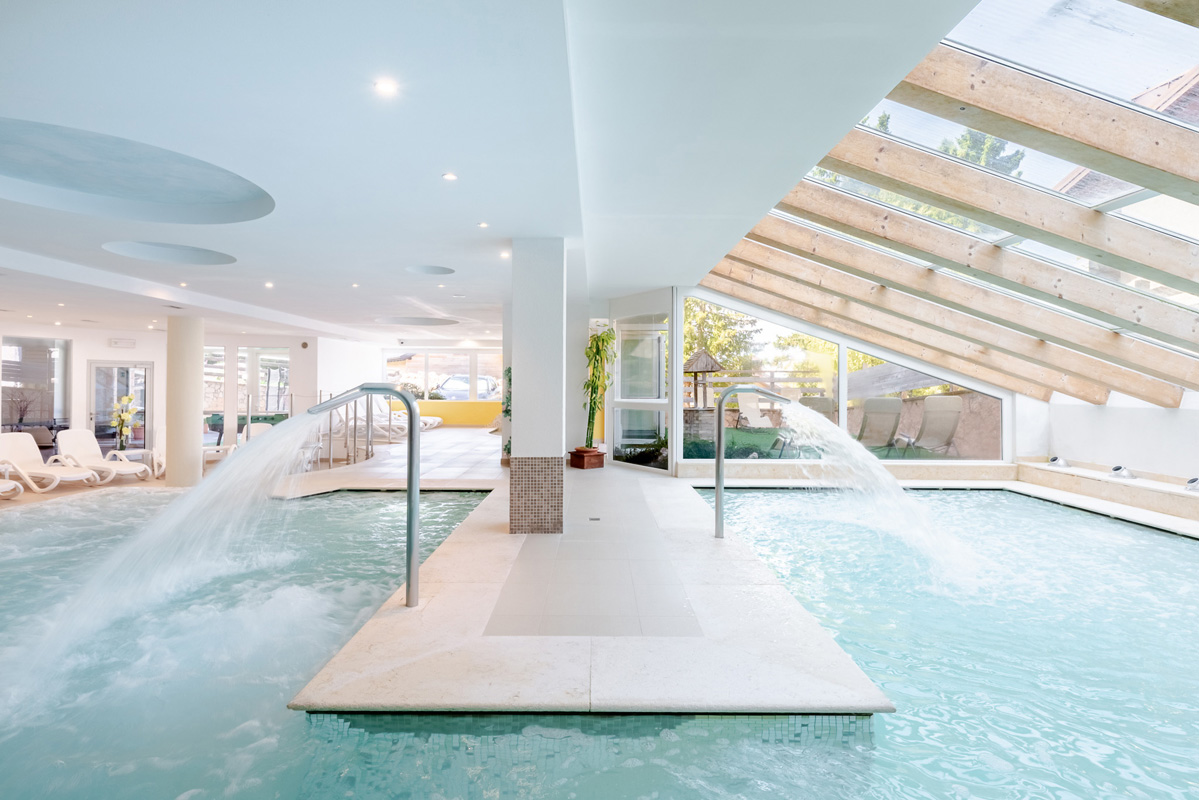 krytý bazén 104 m² atypického tvaru s protiproudem, umělým vodopádem, venkovní sluneční terasa s lehátky, dětský bazének 10 m² s lehátky, vířivka až pro 9 osob, sauna, aromatická sauna, pára, termárium, 4x multifunkční sprcha, horizontální solárium*, relaxační koutek s lehátky, kneippův chodník, masáže*, kosmetické služby*, posilovna