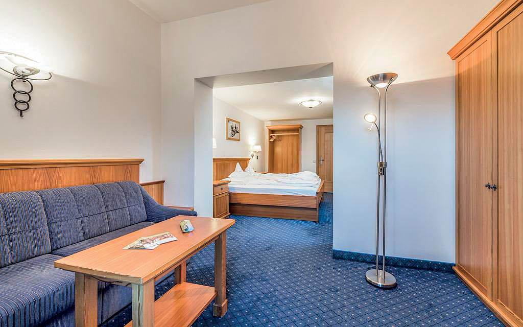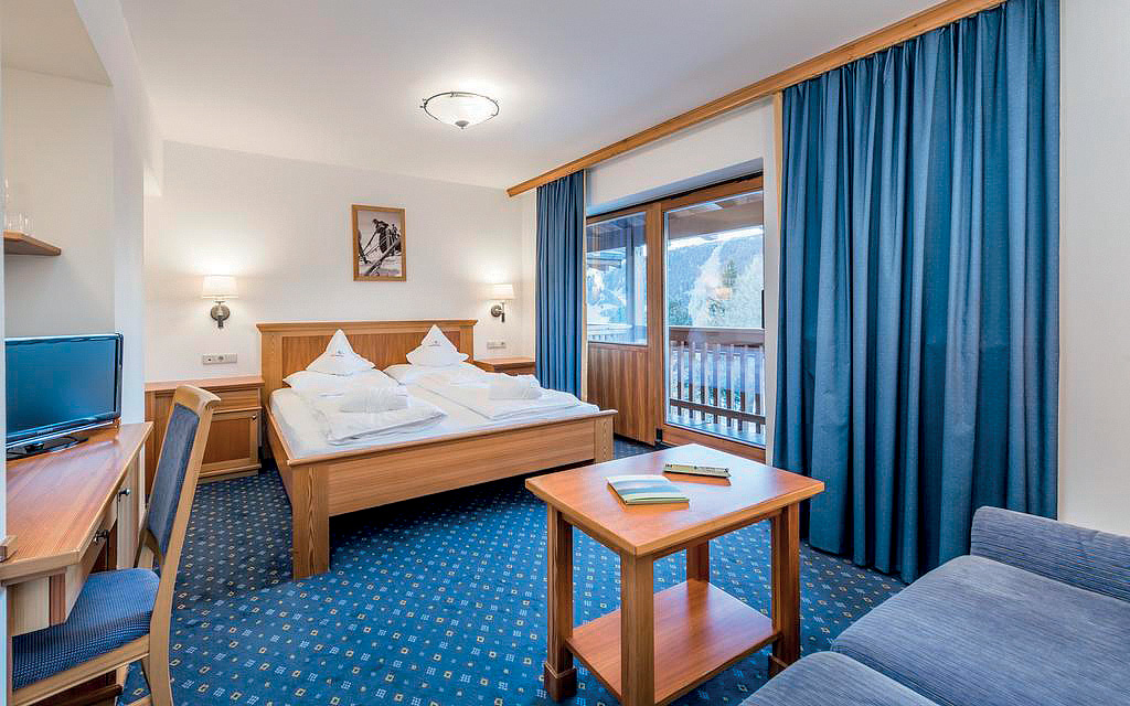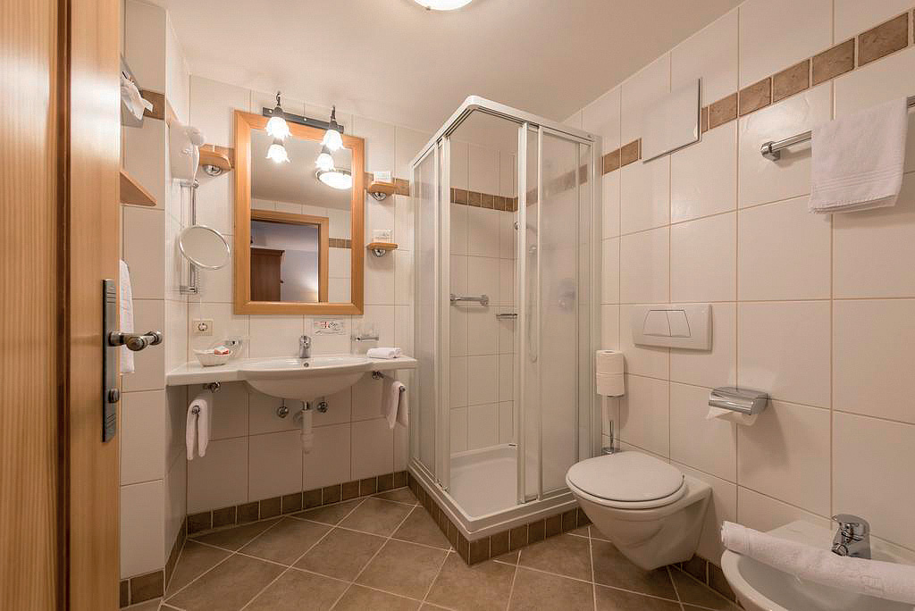 28 m² - pokoj s manželskou postelí a případně rozkládacím gaučem pro 1 či 2 osoby, sociální zařízení se sprchou či vanou, balkon s výhledem na Dolomity