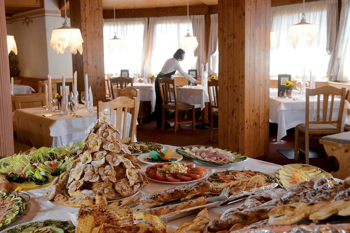 servírované menu s výběrem ze 3 až 4 teplých předkrmů a 3 až 4 hlavních jídel s přílohou, bohatý salátový bufet, dezerty, ovoce a sýry formou bufetu, nápoje za poplatek