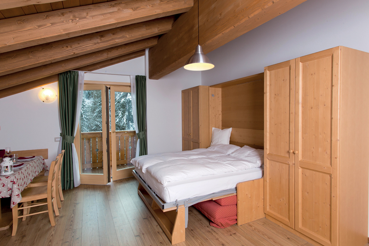mono 4 - 33 až 44 m² - obývací pokoj s kuchyňským koutem, skříňovou manželskou postelí a palandou či 2 samostatnými lůžky (u některých apartmánů v částečně oddělené místnosti), sociální zařízení