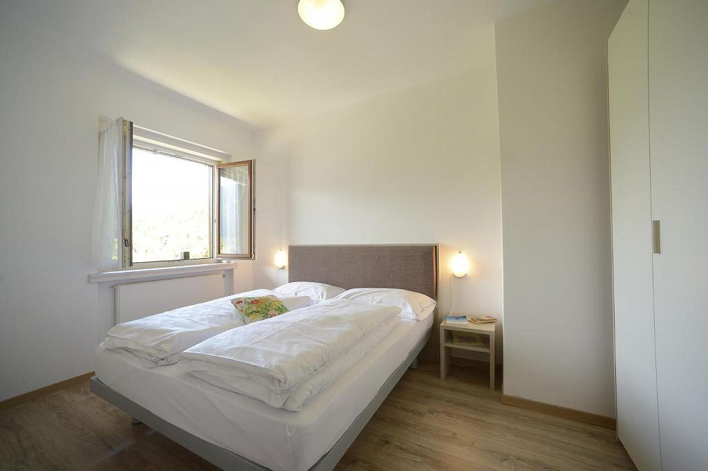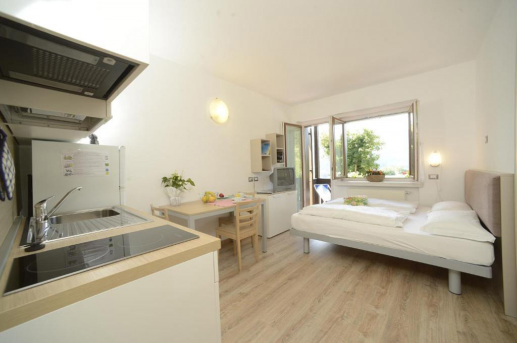 34 m² - orientace apartmánu na sever - 1 ložnice s manželskou postelí, obývací pokoj s kuchyňským koutem a rozkládacím gaučem pro 2 osoby, sociální zařízení, malý balkon (s výjimkou 3 apartmánů)