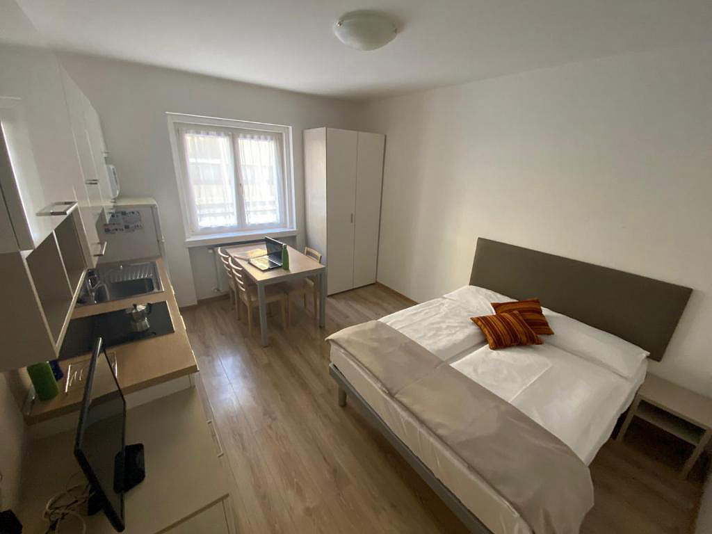 20 m² - obývací pokoj s kuchyňským koutem a manželskou postelí či rozkládacím gaučem pro 2 osoby (možno i typ „šuplík“), sociální zařízení, balkon