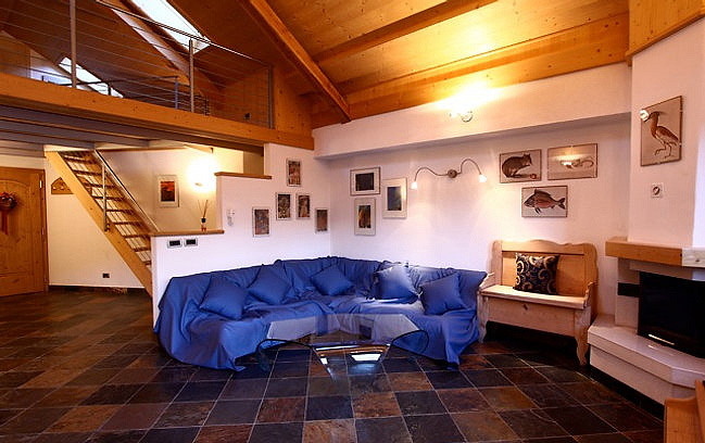65 m² - 1 ložnice s manželskou postelí, obývací pokoj s kuchyňským koutem a rozkládacím gaučem pro 2 osoby, neuzavřené zvýšené patro v rámci obývacího pokoje s manželskou postelí umístěnou v podkrovní části, 1x sociální zařízení se sprchou, 1x sociální zařízení s vanou, balkon