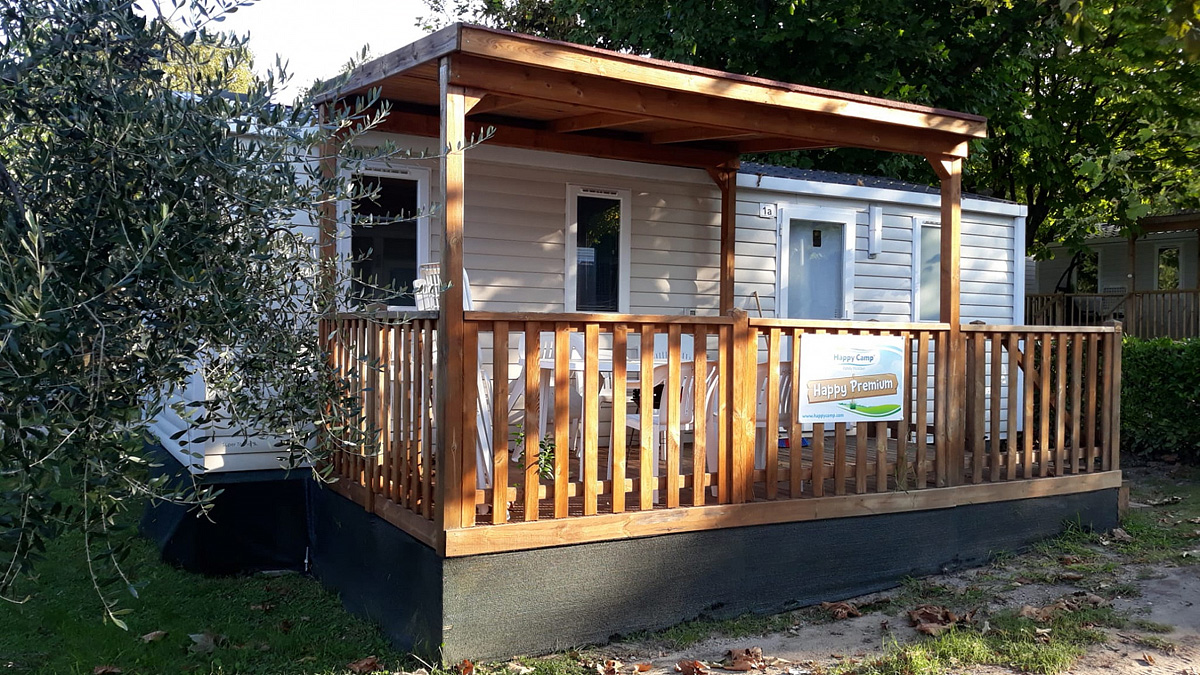 mobilhome Happy Premium 7 - 32 m² - ložnice s manželskou postelí, 2 ložnice se 2 samostatnými lůžky, obývací pokoj s kuchyňským koutem a lavicí přestavitelnou na lůžko, sociální zařízení se sprchou, částečně krytá terasa
