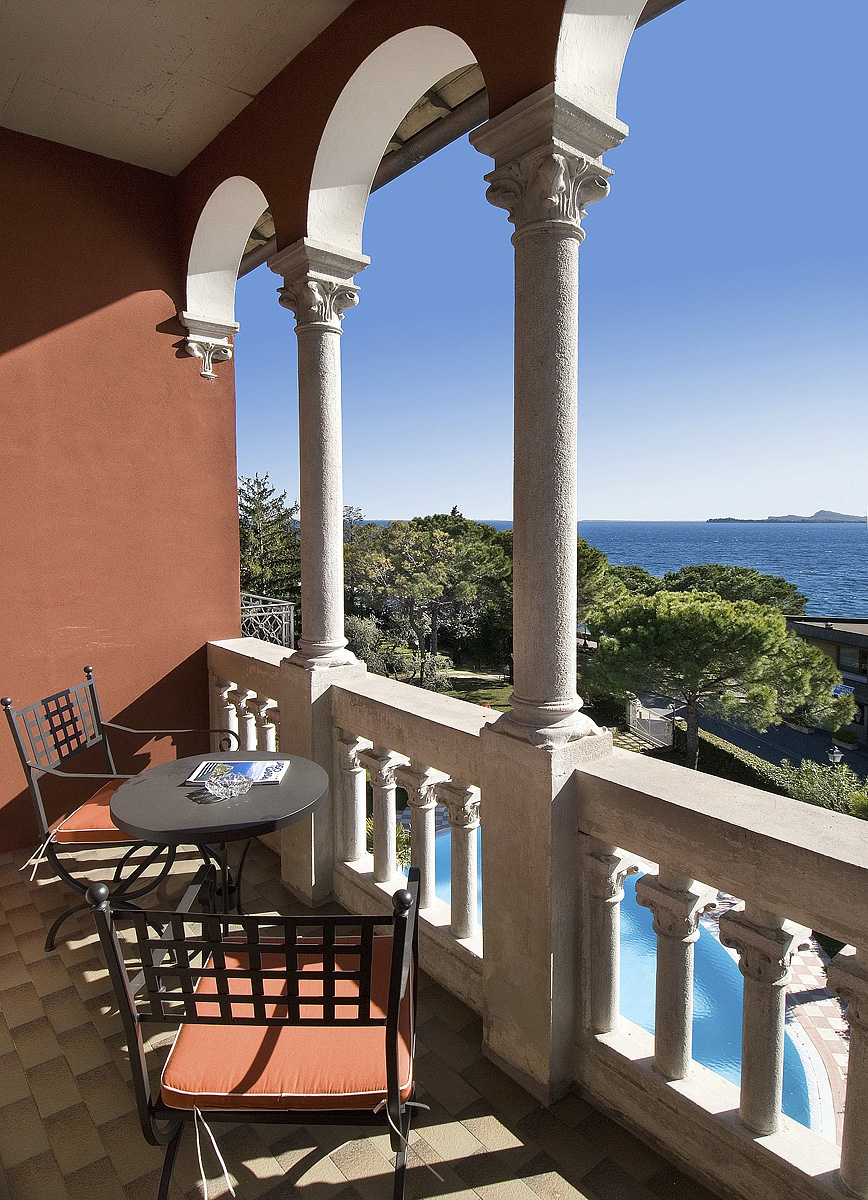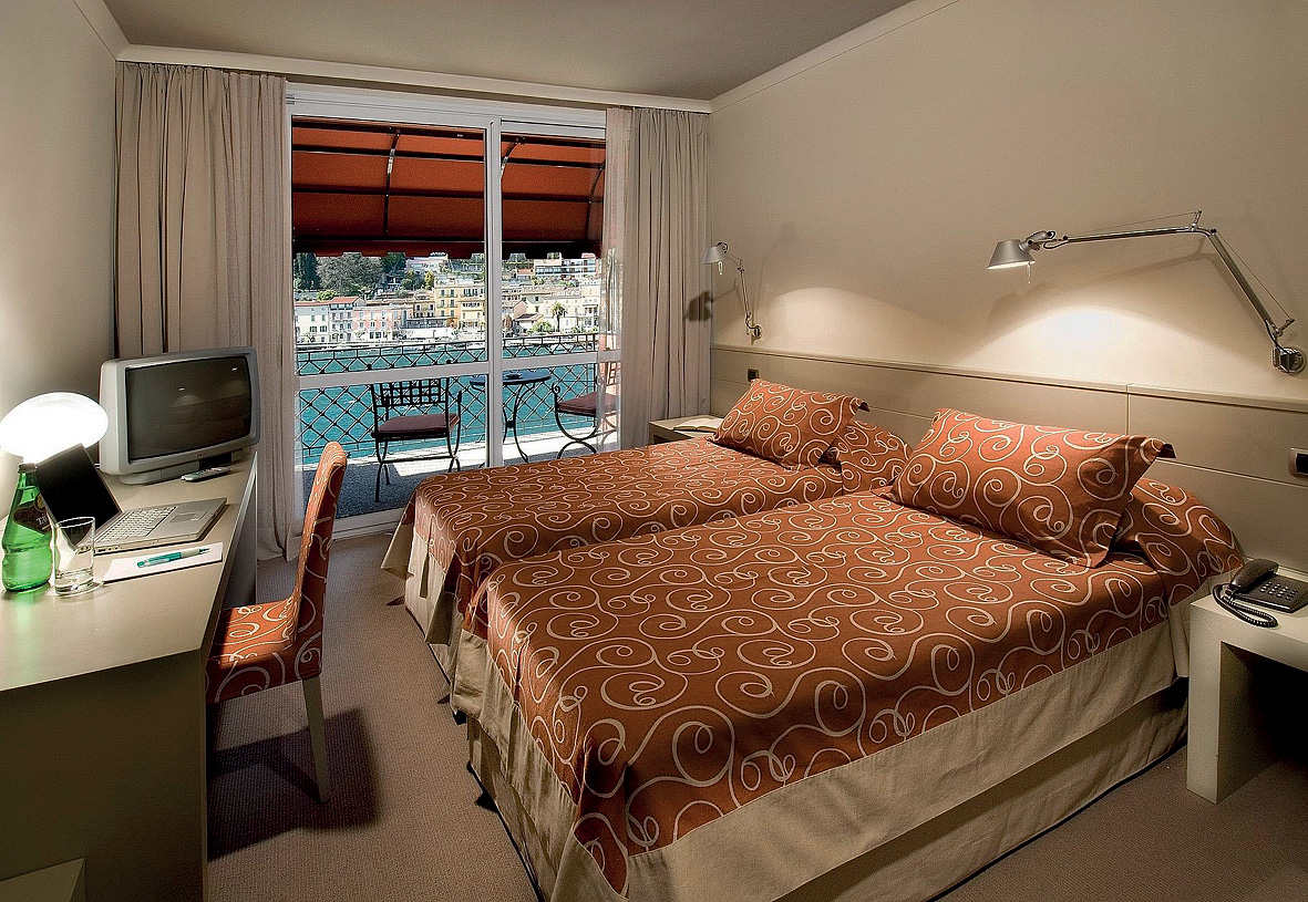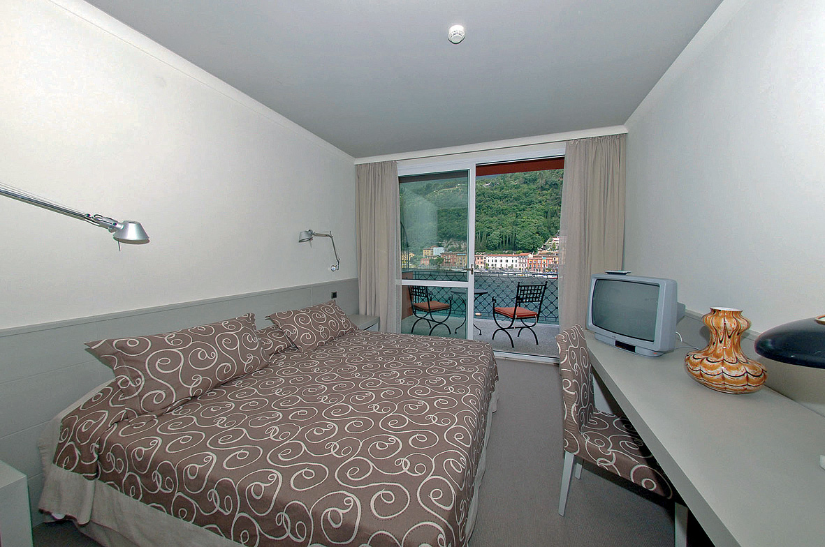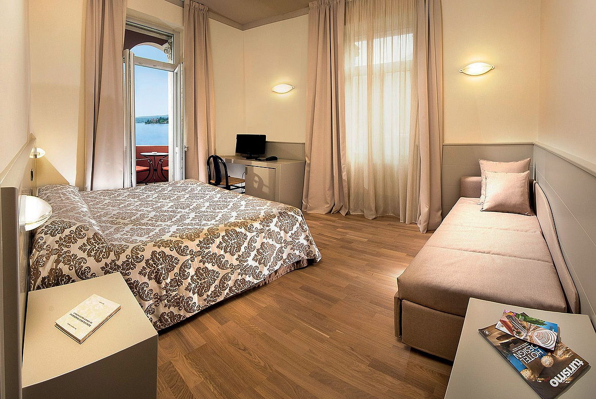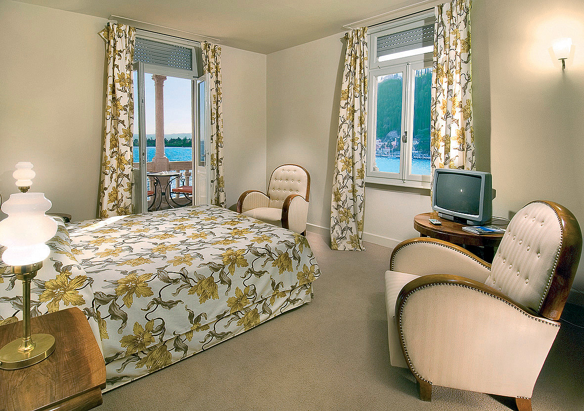 pokoj s manželskou postelí či 2 samostatnými lůžky, sociální zařízení se sprchou či vanou, balkon, výhled na jezero