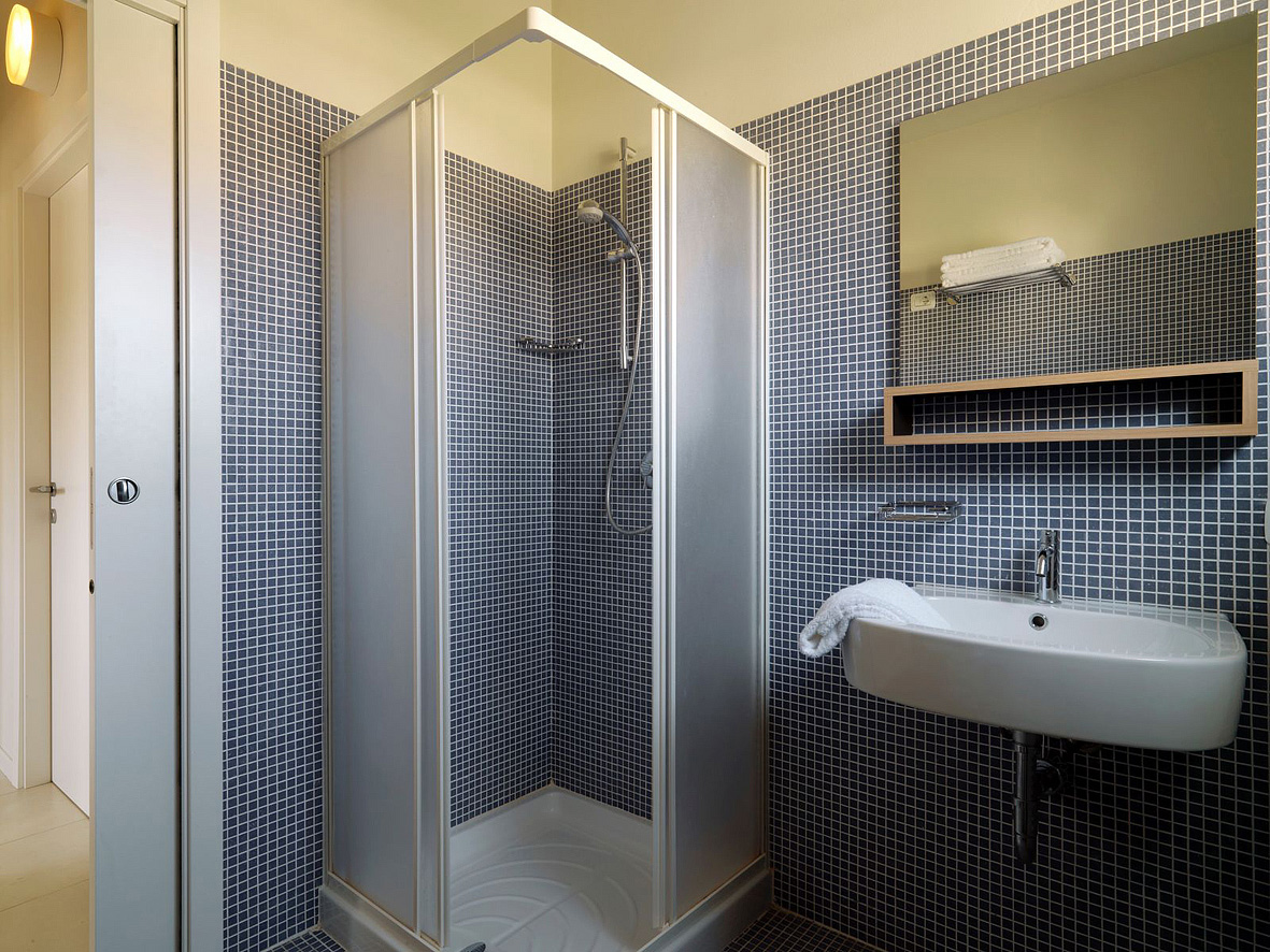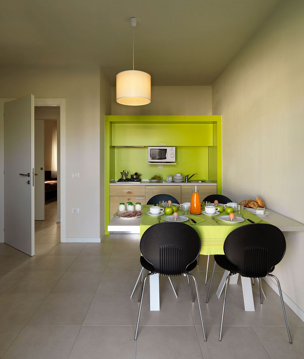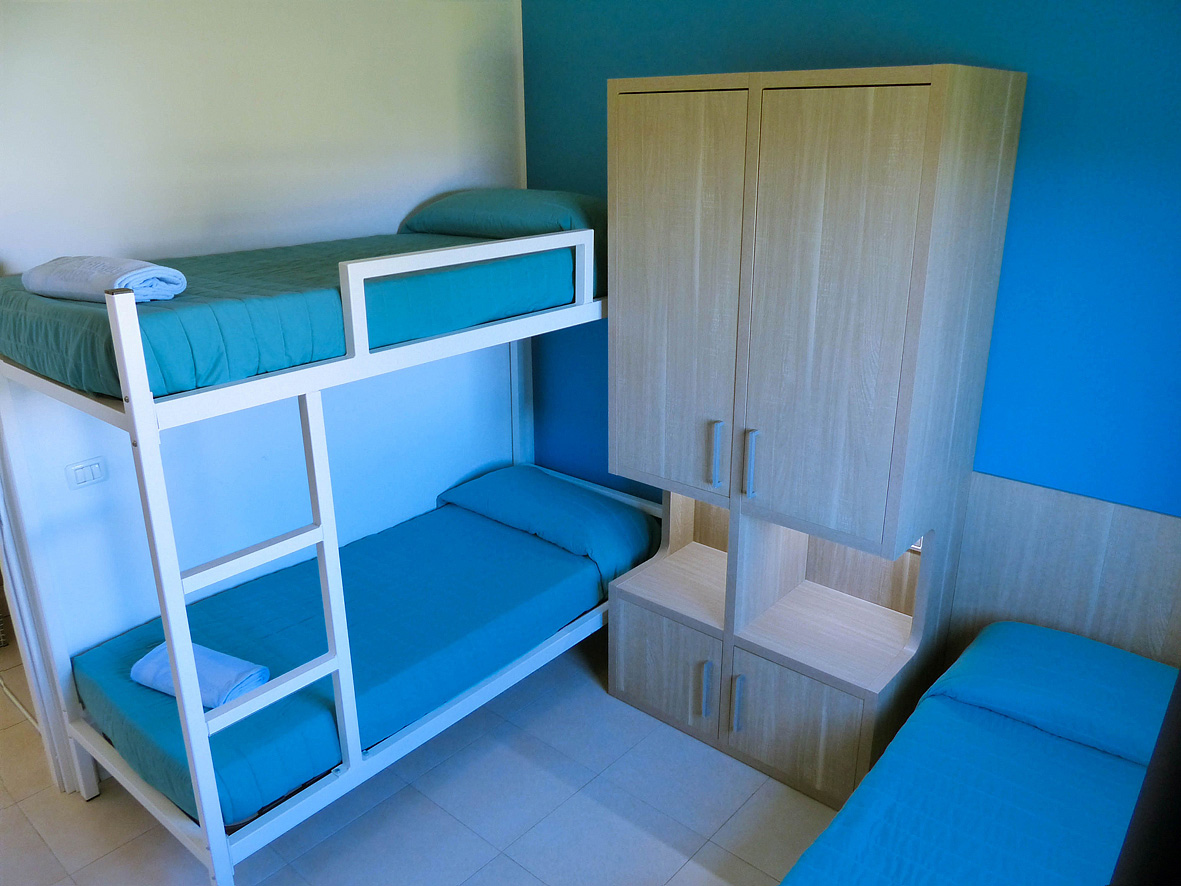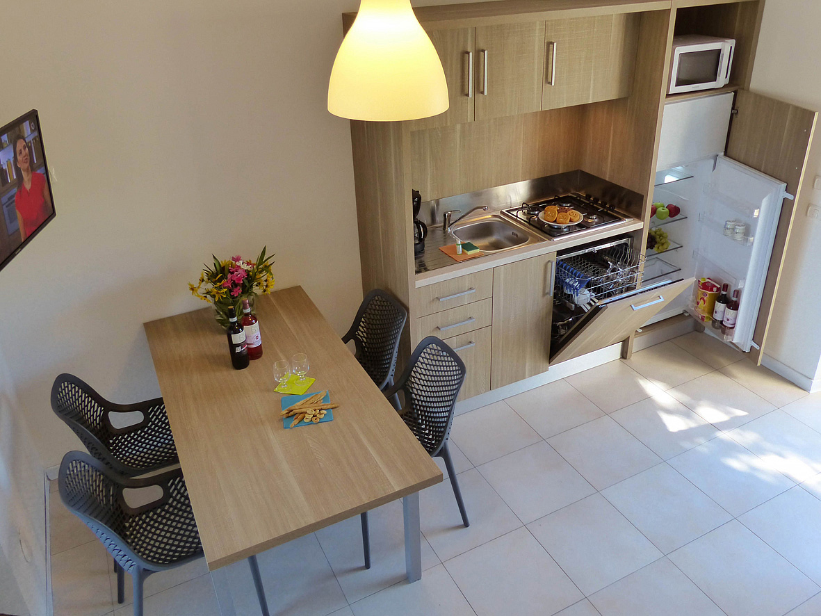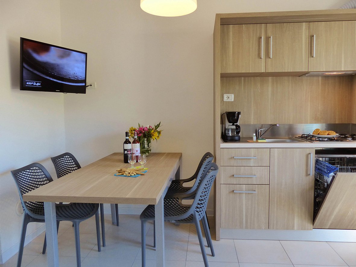 38 m² - 1 ložnice s manželskou postelí, 1 ložnice se 2 samostatnými lůžky či palandou, obývací pokoj s kuchyňským koutem a rozkládacím gaučem pro 2 osoby, sociální zařízení se sprchou, terasa; apartmán se nachází v přízemí