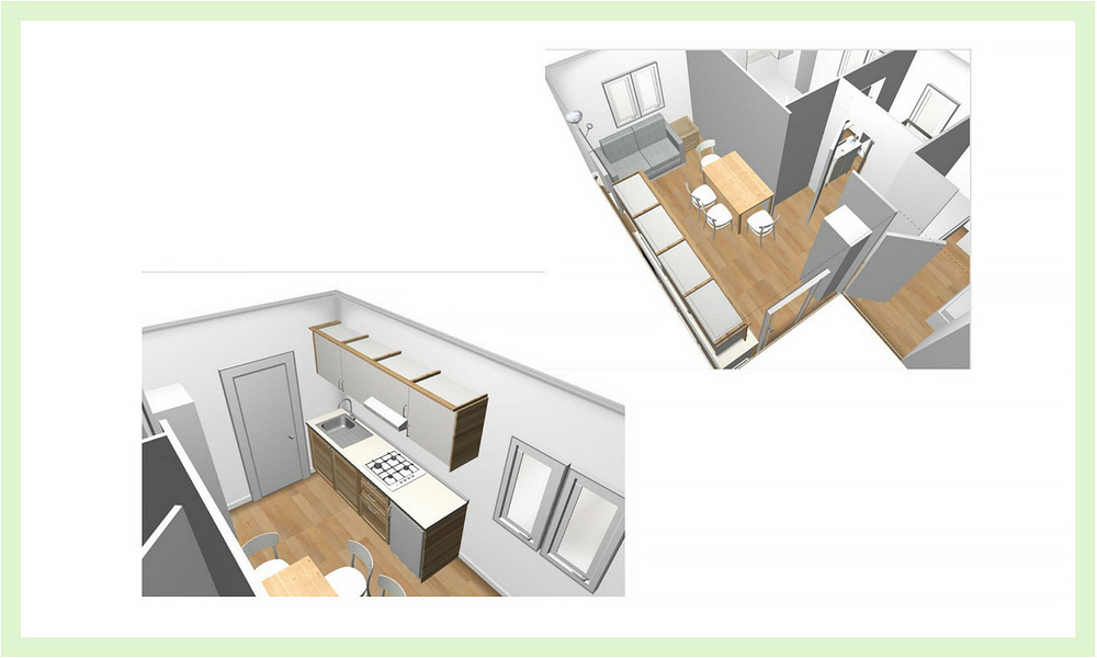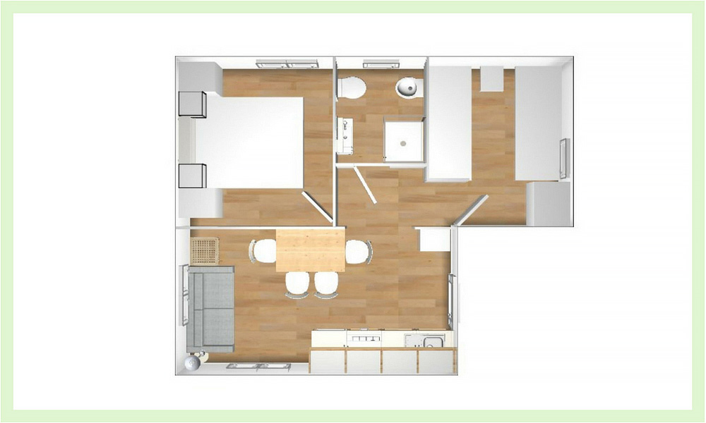 22 až 29 m² - 1 ložnice s manželskou postelí a 1 samostatným lůžkem, obývací pokoj s kuchyňským koutem, sociální zařízení, terasa