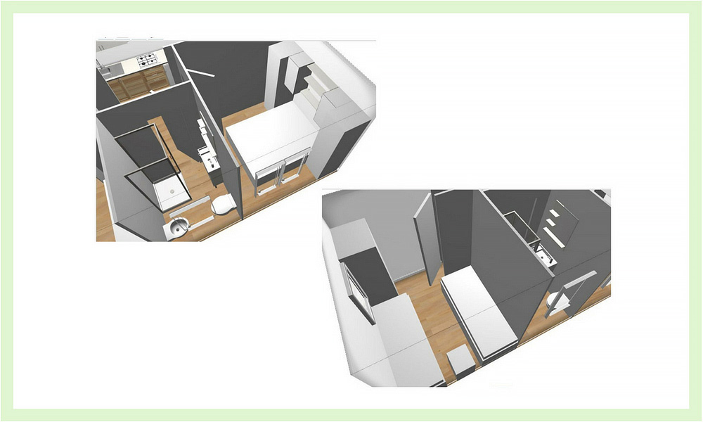 17 až 19 m² - 1 ložnice s manželskou postelí, obývací pokoj s kuchyňským koutem, sociální zařízení, terasa