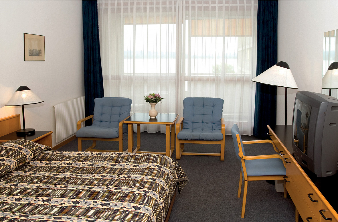 pokoj s manželskou postelí nebo 2 samostatnými lůžky a případně 1 samostatným lůžkem, sociální zařízení zpravidla s vanou, balkon s výhledem na jezero; maximální obsazenost 2 dospělé osoby a 1 dítě do nedovršených 18 let