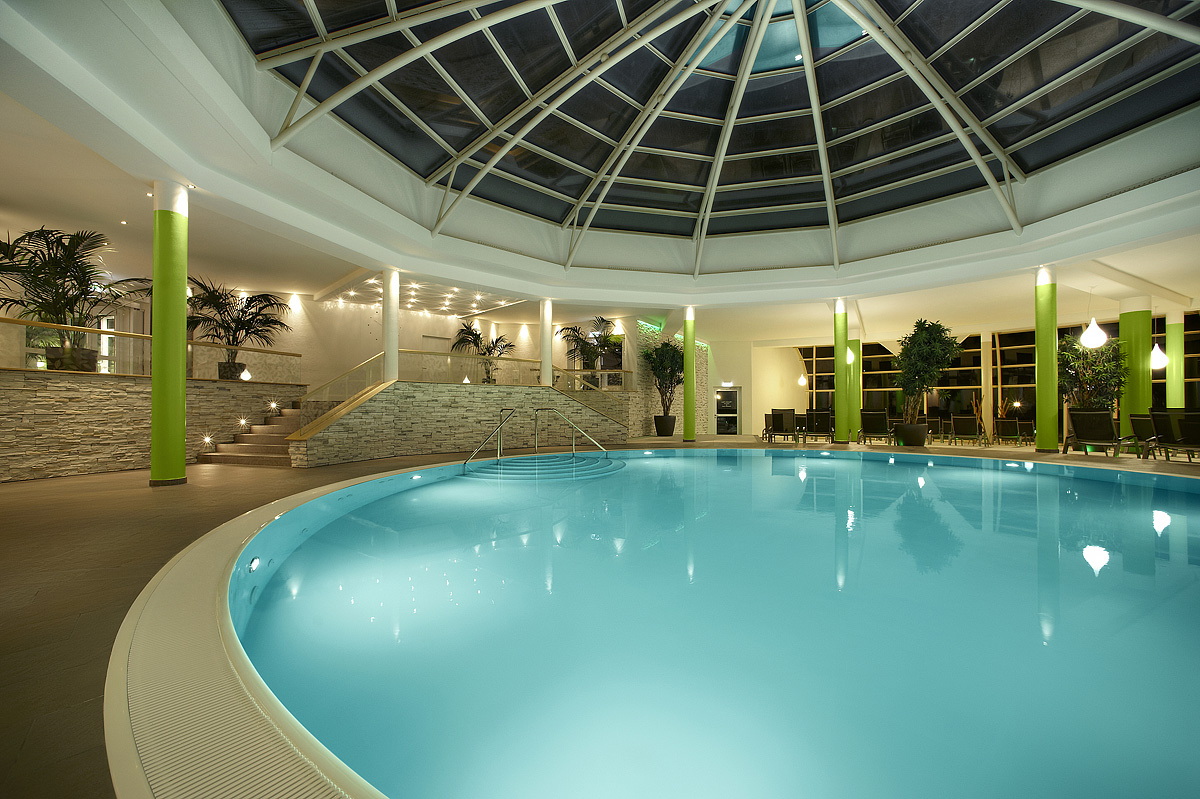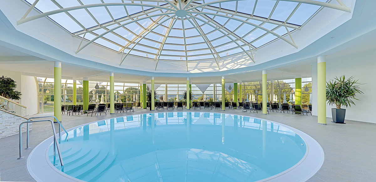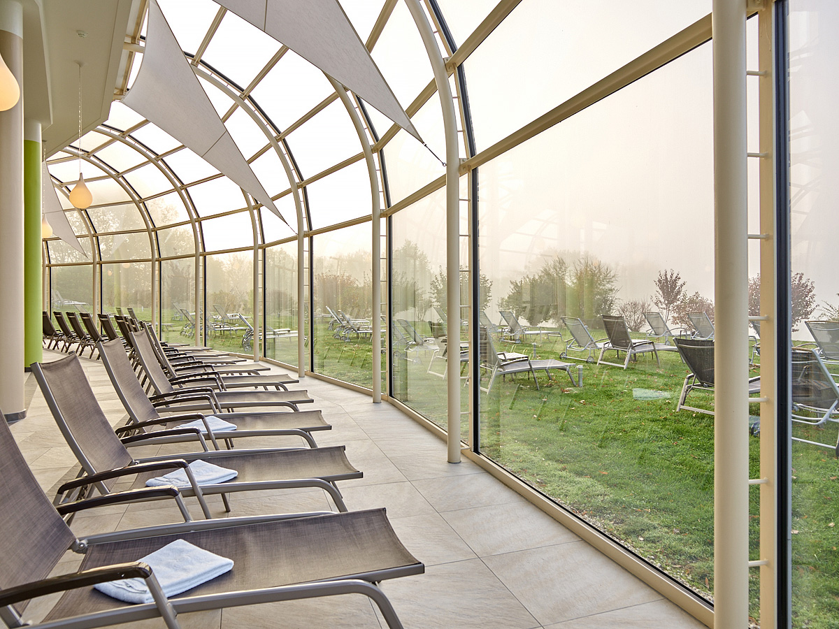 wellness o rozloze 4400 m², venkovní a vnitřní bazén s termální vodou, venkovní a vnitřní vířivky, různé sauny, páry, zážitkové sprchy, relaxační místnost s posezením a vyhřívanými lehátky, posilovna, rozlehlá zahrada s lehátky, masáže*