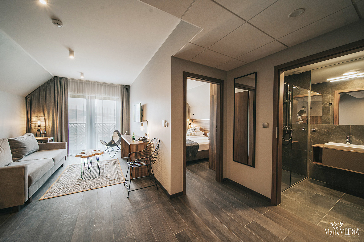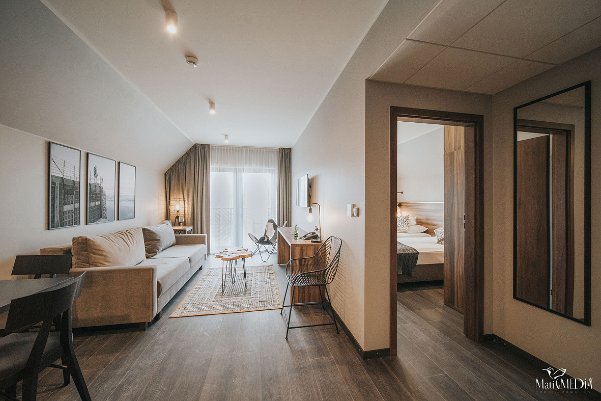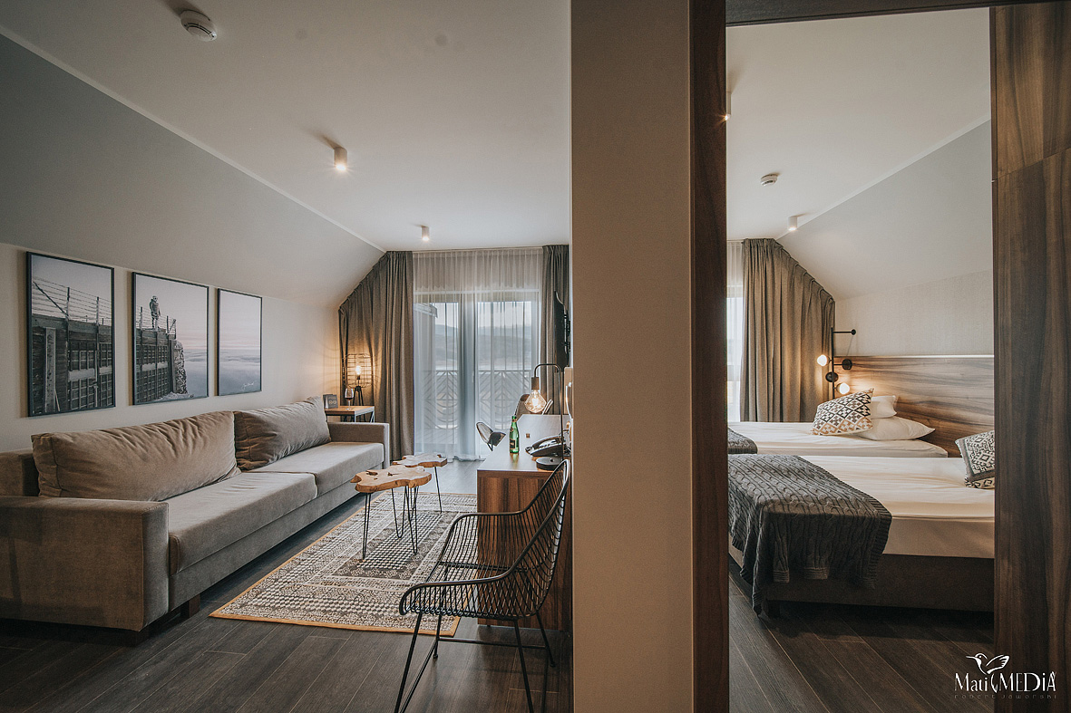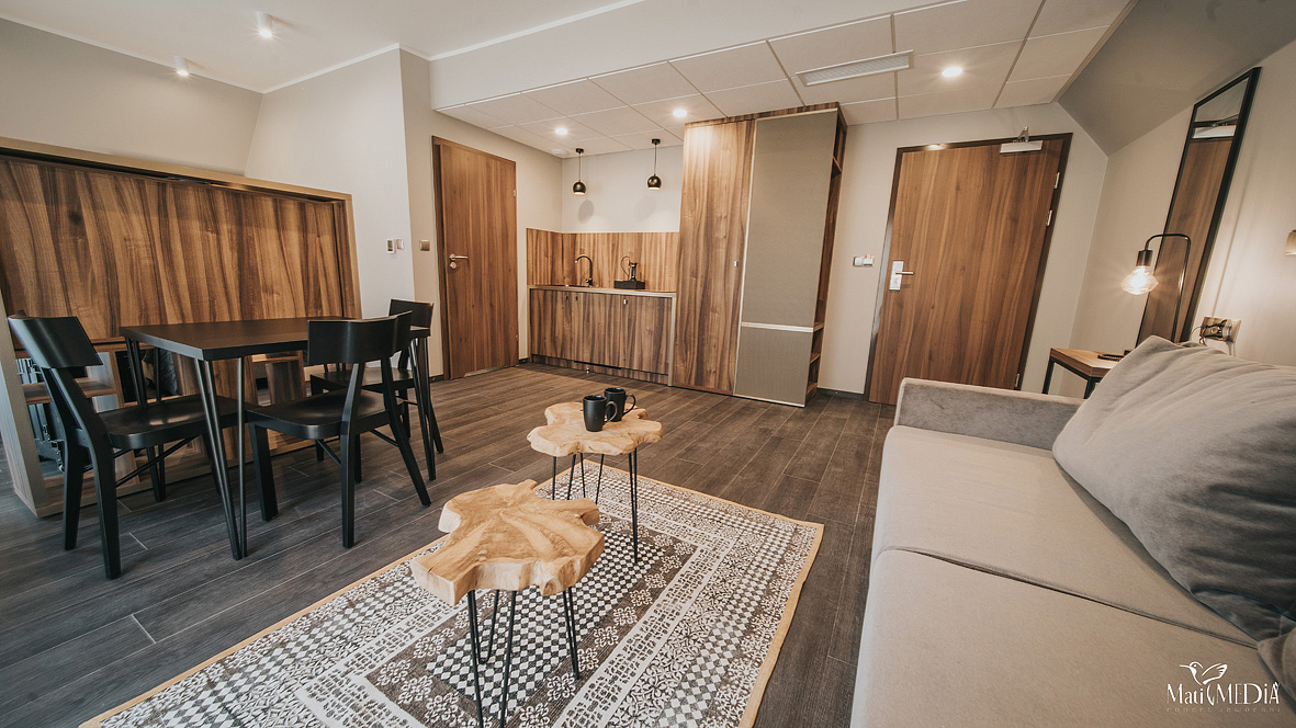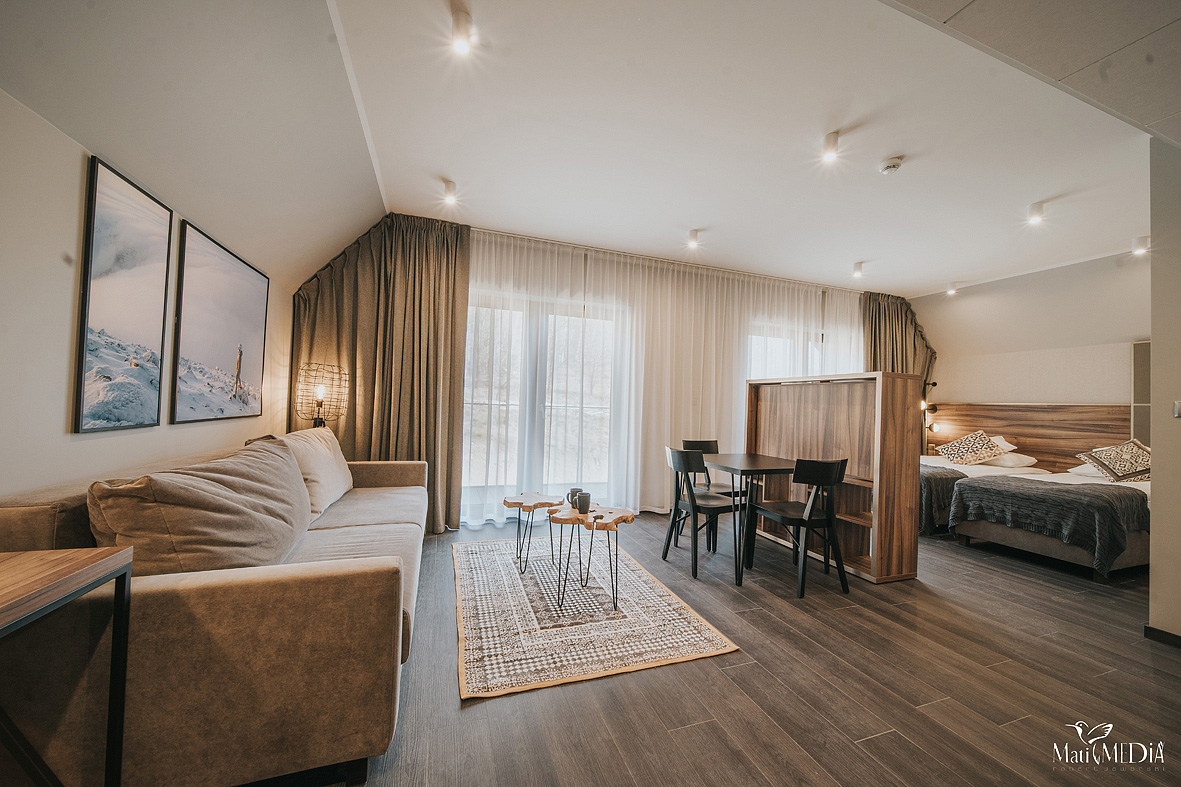 38 m² - ložnice s manželskou postelí, obývací pokoj s rozkládacím gaučem pro 2 osoby, kuchyňský kout, sociální zařízení, balkon či terasa s výhledem na les; minimální obsazenost pokoje jsou 3 osoby