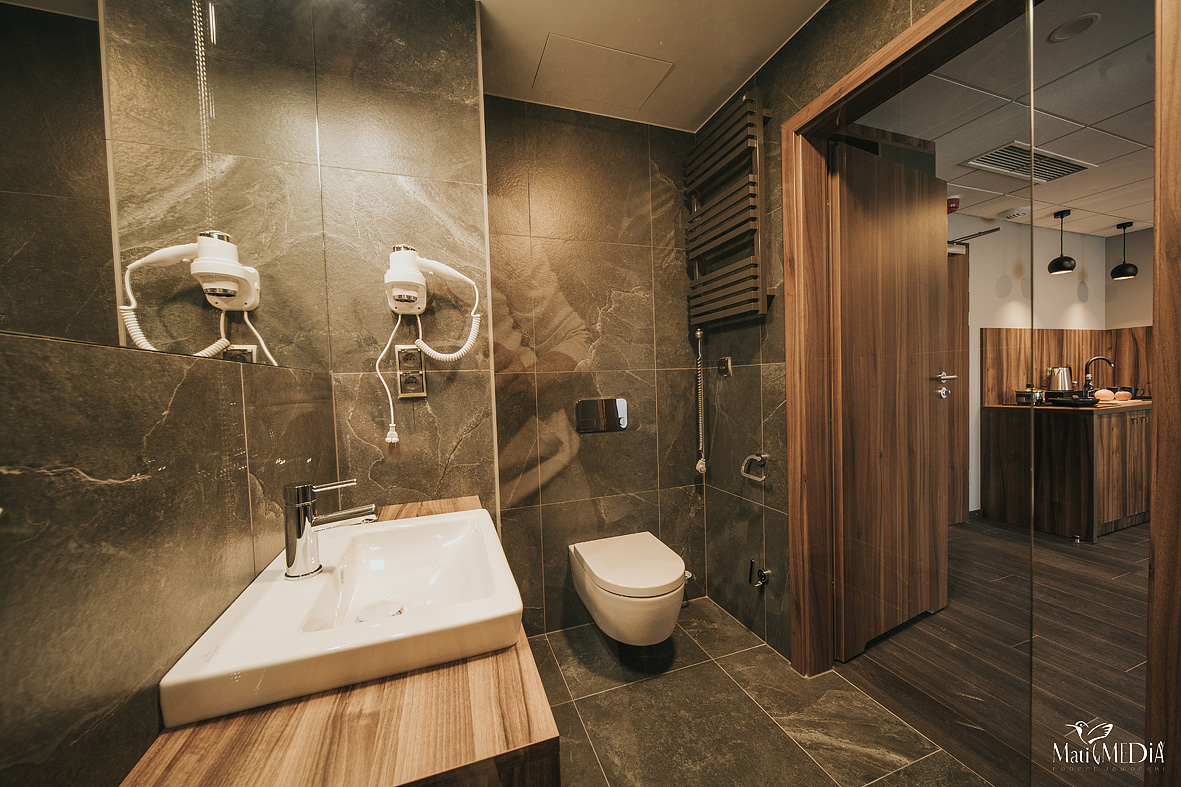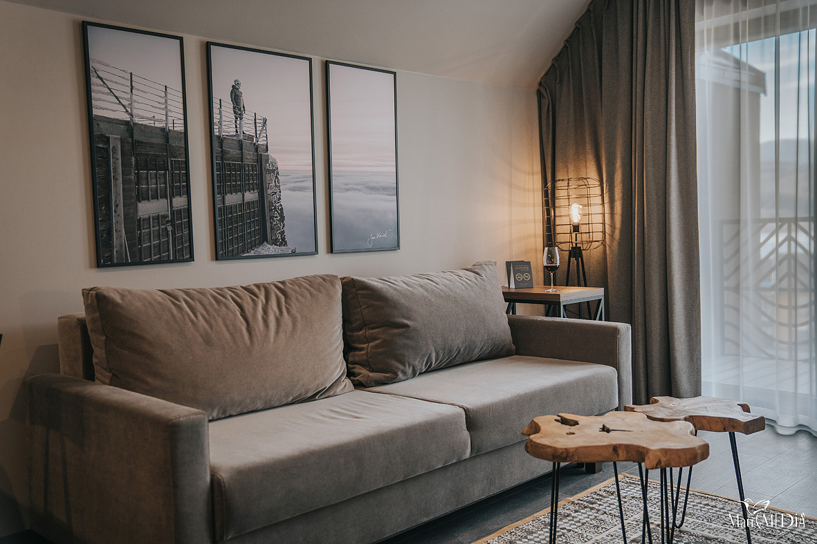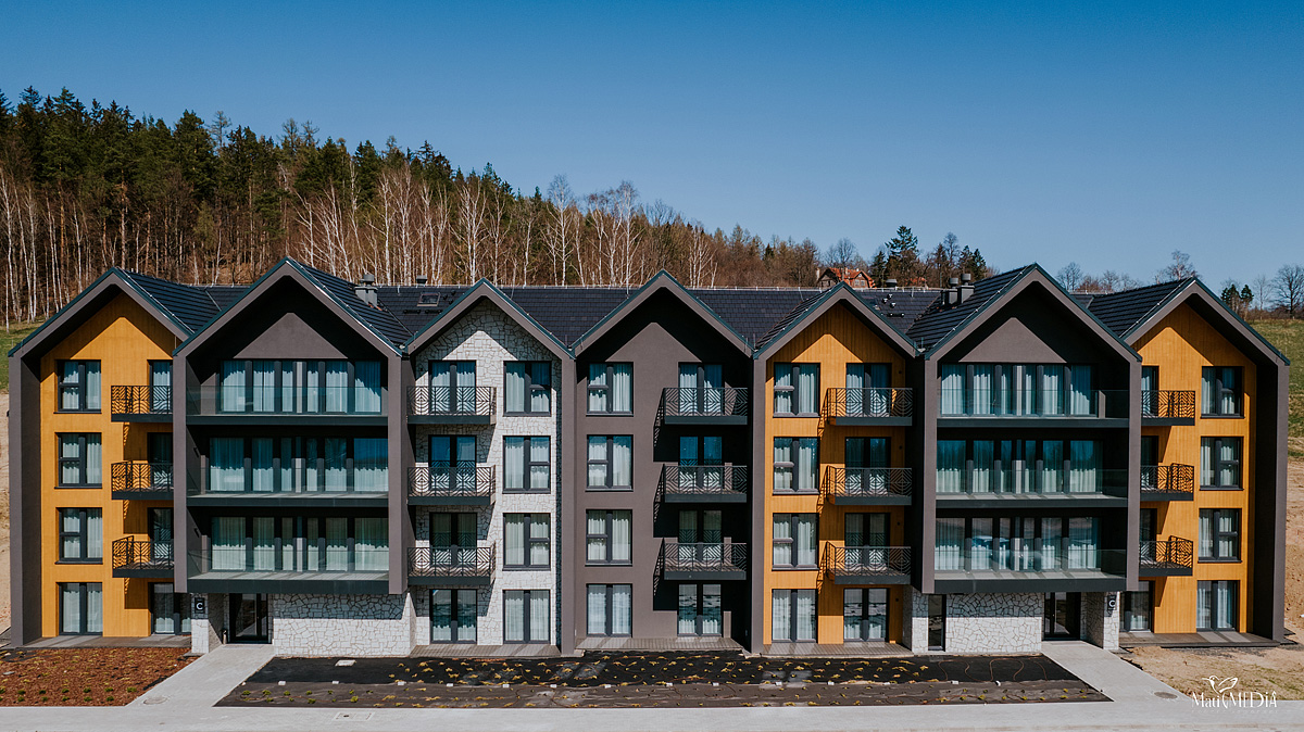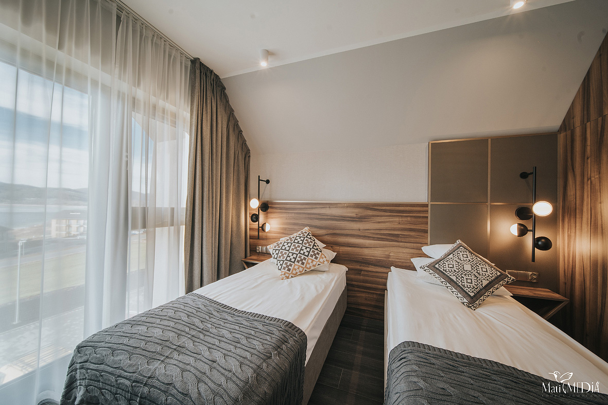 38 m² - ložnice s manželskou postelí, obývací pokoj s rozkládacím gaučem pro 2 osoby, kuchyňský kout, sociální zařízení, balkon či terasa s výhledem na les; minimální obsazenost pokoje jsou 3 osoby