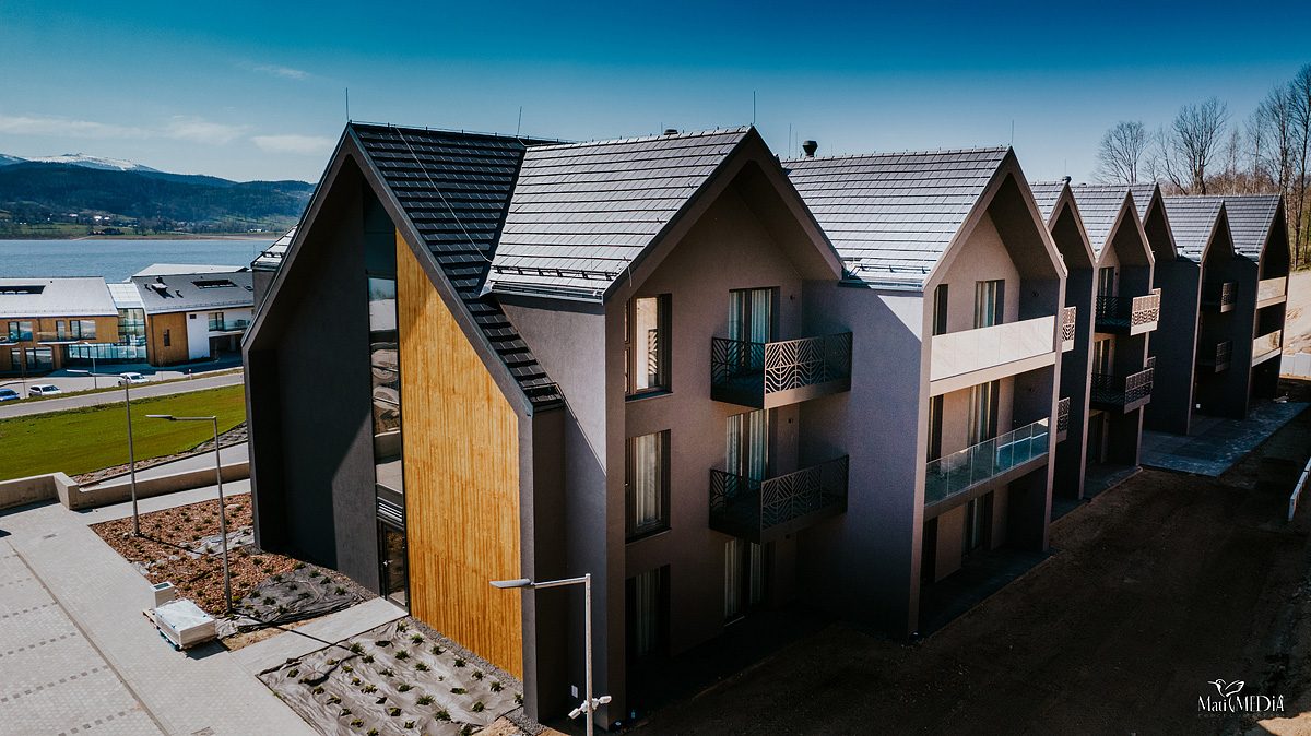 38 m² - ložnice s manželskou postelí, obývací pokoj s rozkládacím gaučem pro 2 osoby, kuchyňský kout, sociální zařízení, balkon či terasa s výhledem na jezero nebo hory; minimální obsazenost pokoje jsou 3 osoby