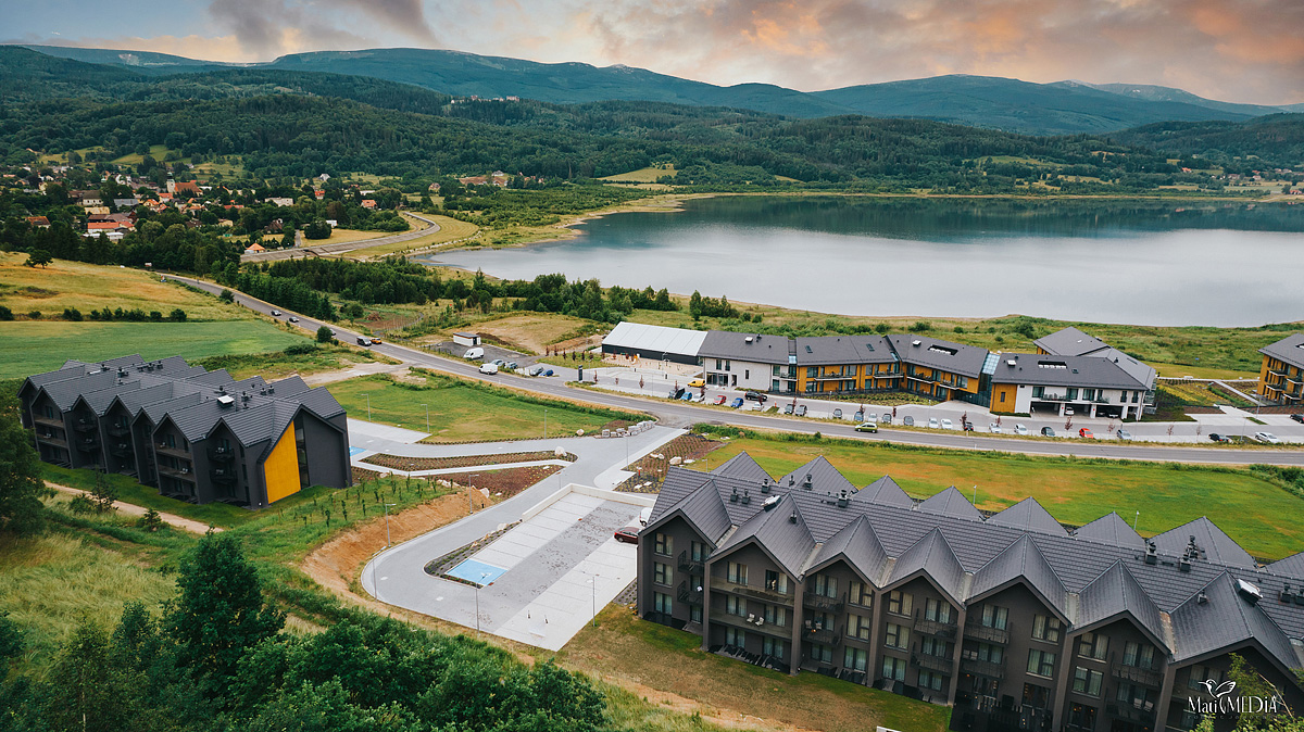 moderně zařízený rozlehlý resort s apartmánovými domy a hlavní budovou s hotelovými pokoji