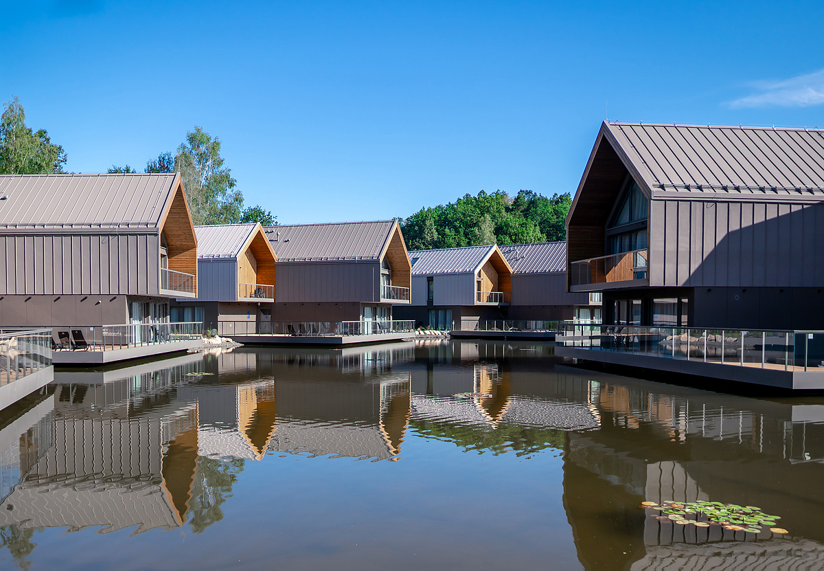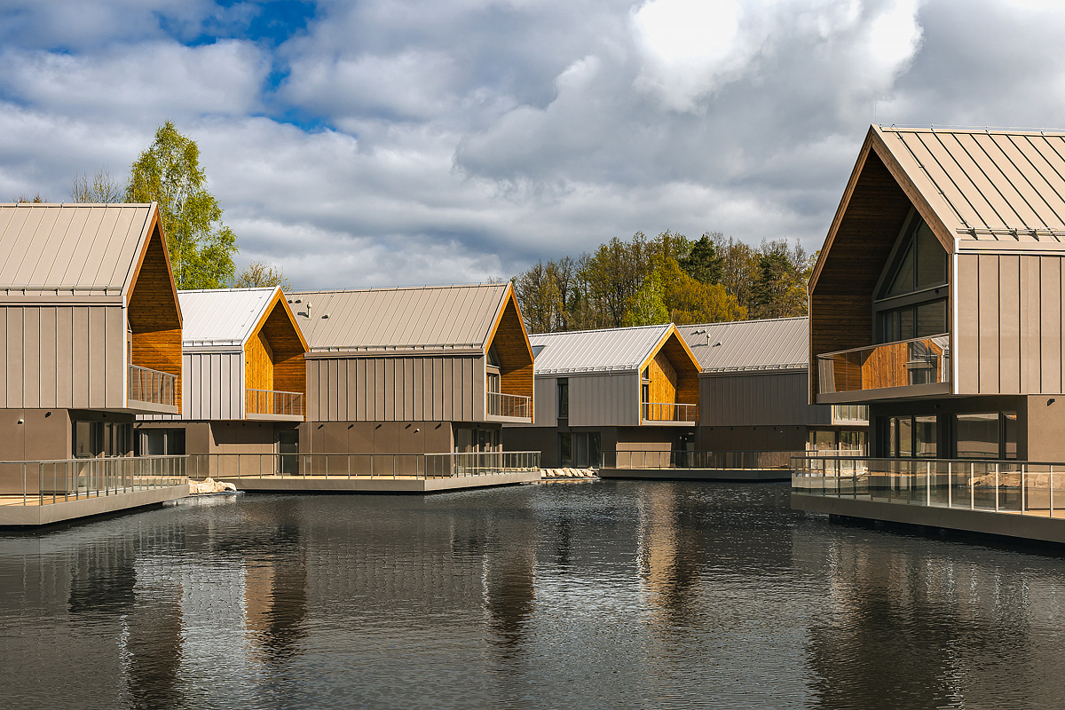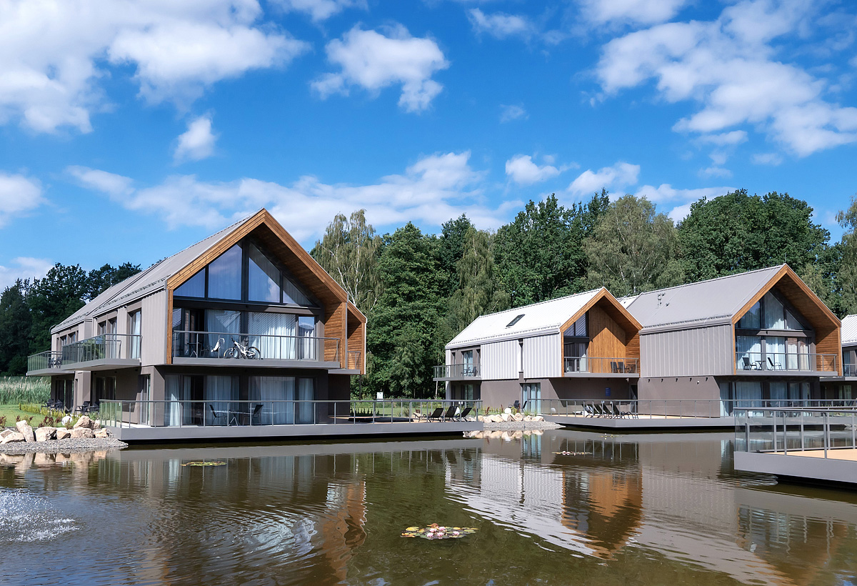 33 až 40 m², ložnice s manželskou postelí či 2 samostatnými lůžky, obývací pokoj s kuchyňským koutem a rozkládacím gaučem formou přistýlky až pro 2 osoby, sociální zařízení, výhled na okrasné jezírko