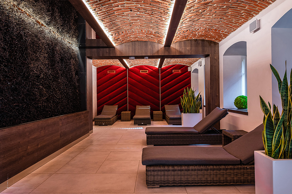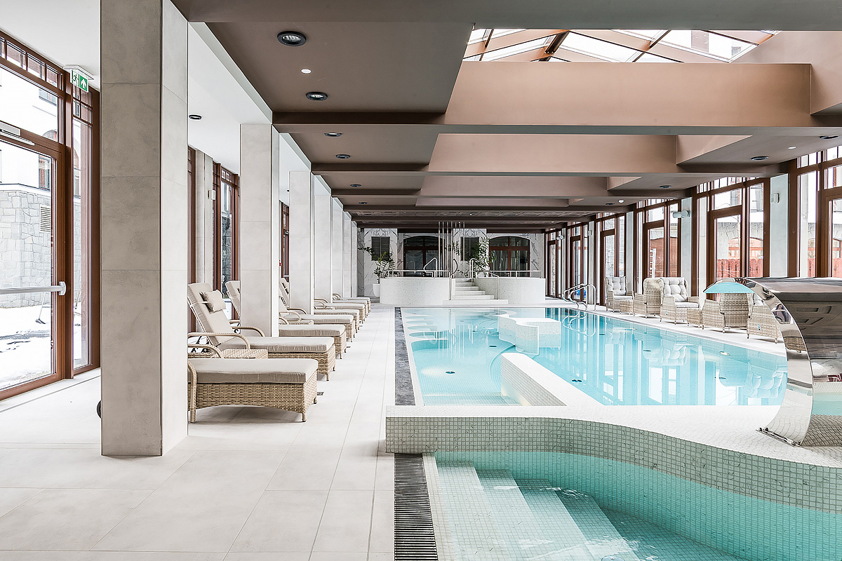 vnitřní bazén 70 m², sauna, sauna relaxační zóna: solná jeskyně, vnitřní a venkovní jacuzzi, masáže*, kosmetické služby*, široká nabídka léčebných a regeneračních procedur*, posilovna