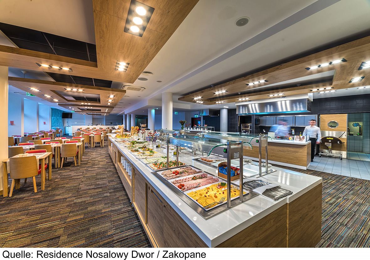 při dokoupení polopenze též večeře formou bufetu s výběrem hlavních jídel, polévek, předkrmů, salátového bufetu, dezertů, nápoje za poplatek