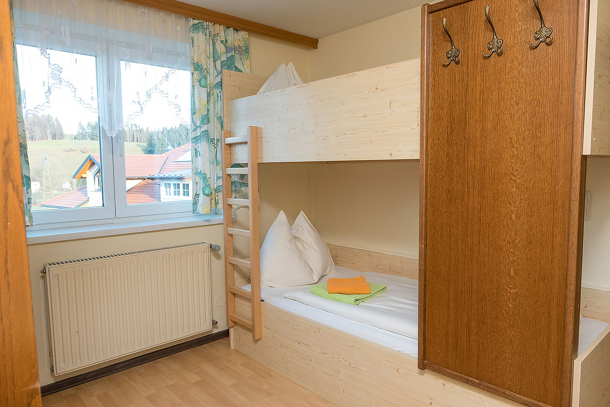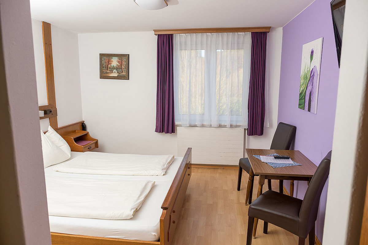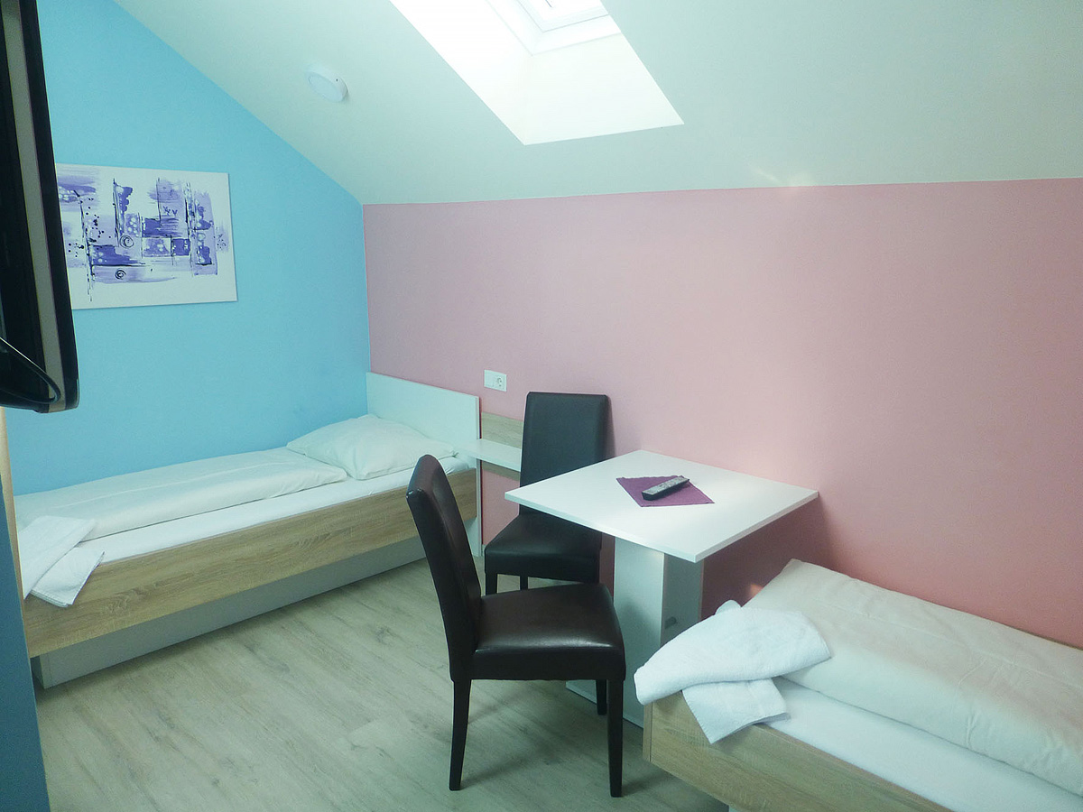 12 m² - pokoj s manželskou postelí či 2 samostatnými lůžky, umyvadlo přímo v ložnici, sociální zařízení včetně WC pouze na chodbě (k užívání hostů i z jiných pokojů)