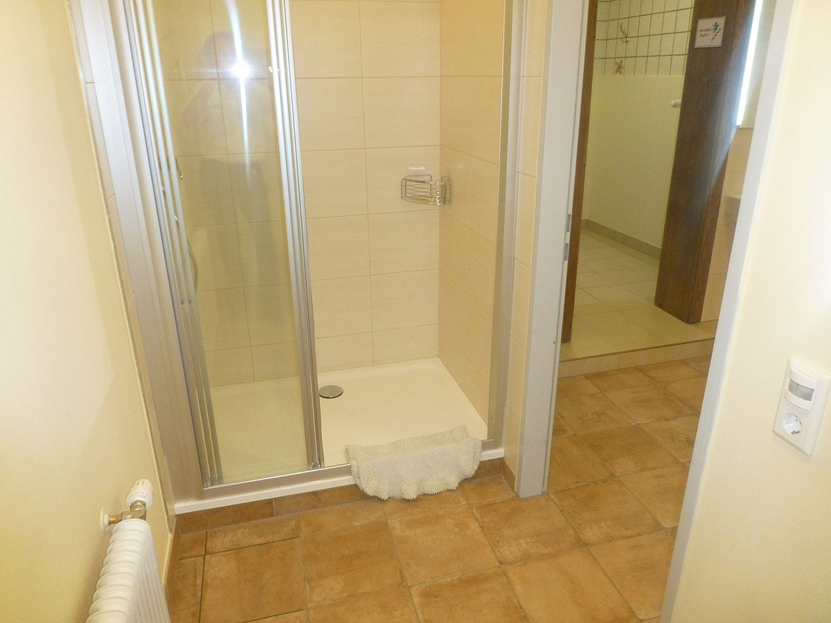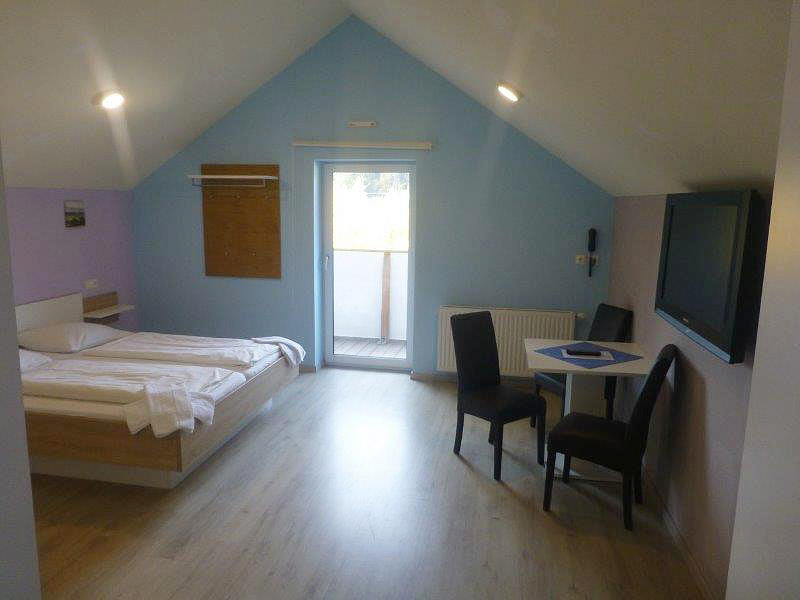 15 m² - pokoj s manželskou postelí či 2 samostatnými lůžky, sprchový kout a umyvadlo přímo v ložnici, WC pouze na chodbě (k užívání hostů i z jiných pokojů)