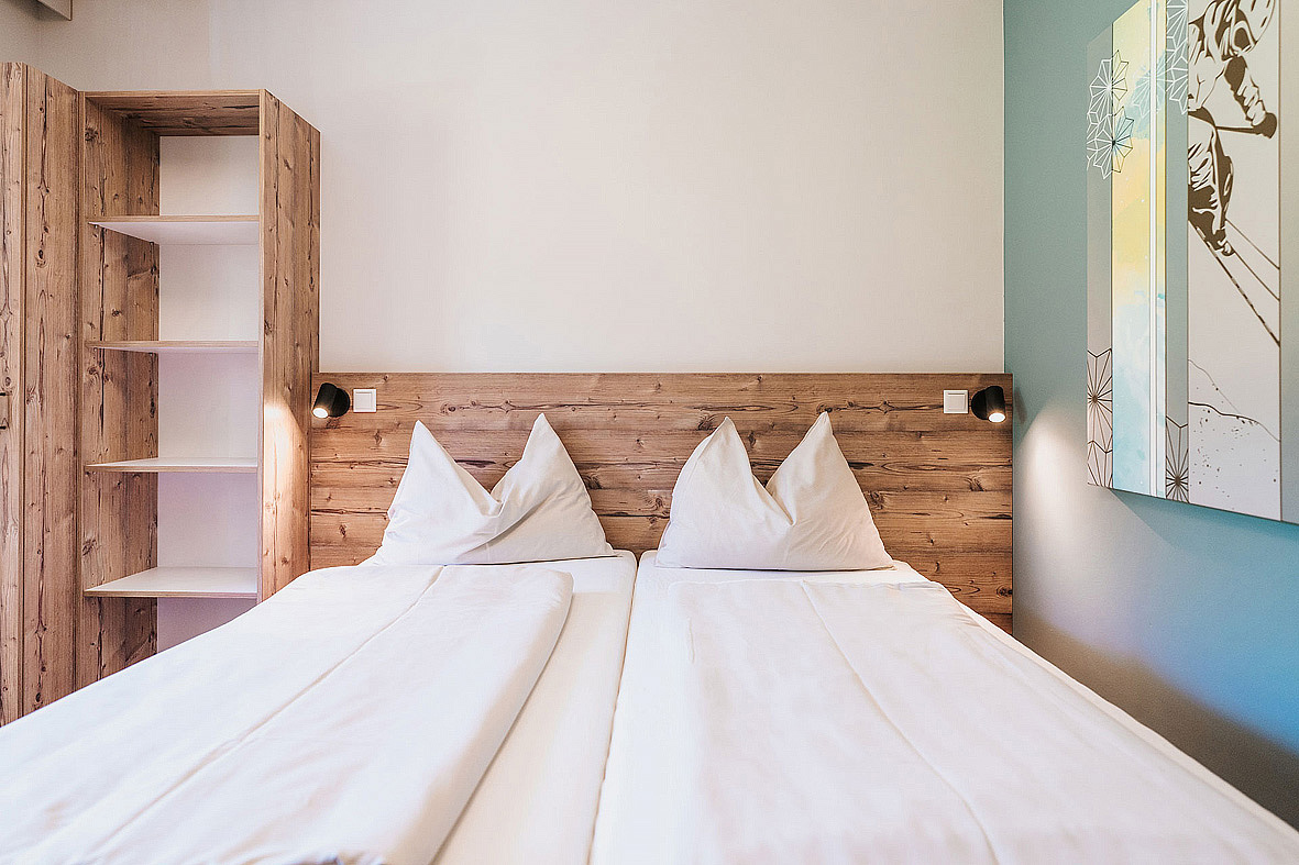 Family 3+2 - 42 m² - 2 navzájem dveřmi propojené pokoje s manželskou postelí s oddělitelnými lůžky, možnost až 3 přistýlek, 2x sociální zařízení, 2x oddělené WC, 2x balkon; minimální obsazenost pokoje jsou 4 osoby, děti od 2 let se započítávají do obsazenosti pokoje, maximální obsazenost pokoje jsou 3 dospělé osoby a 2 děti do nedovršených 18 let