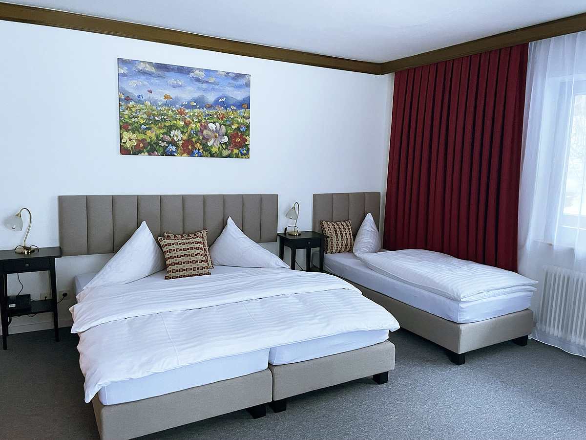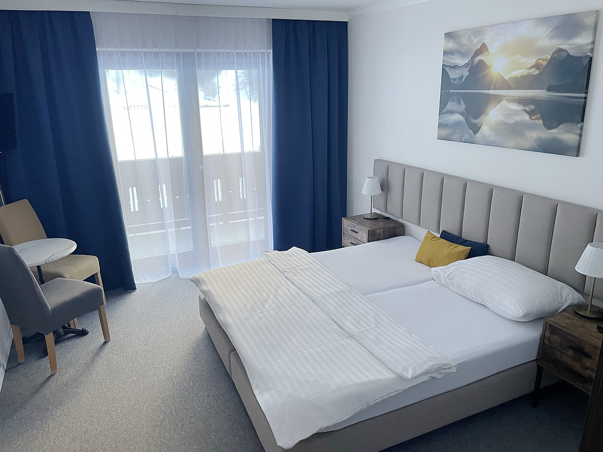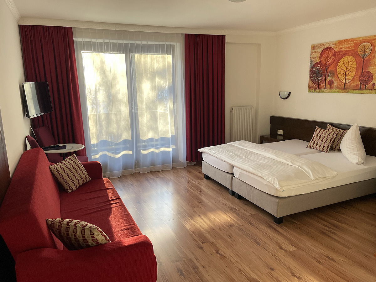 pokoj s manželskou postelí a 1 samostatným lůžkem, sociální zařízení, zpravidla balkon, minimální obsazenost 3 plně platící osoby