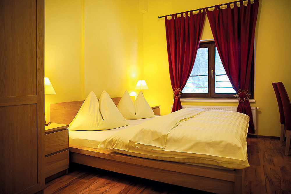 pokoj s manželskou postelí, možnost 3. a 4. lůžka formou rozkládacího křesla či gauče, sociální zařízení, zpravidla balkon